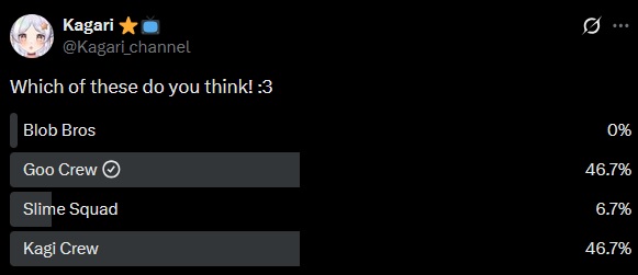 Otaku elf Kagari is having a vote on what to call her new slime ooze thing fan mascotshttps://x.com/Kagari_channel/status/2009086887085134172