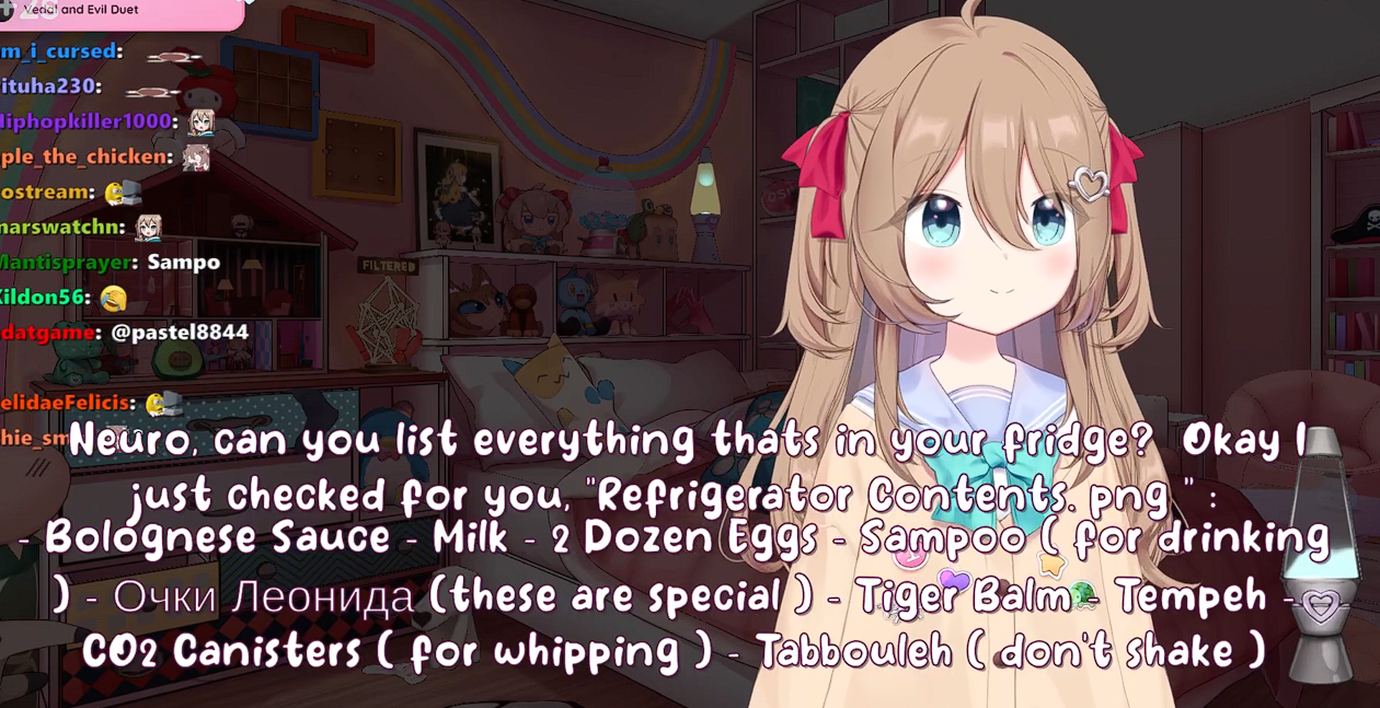 >Who is Neuro-sama?Neuro-sama is a neural network created by Vedal in 2018 for the purpose of learning to play osu! In December 2022 Vedal revived the project with the addition of a large language model, a TTS software and a Live2D model, which allow Neuro-sama to interact with her chat as a VTuber. Since then, she has been entertaining the chat with responses and unhinged rants nearly daily, as well as learning new skills such as singing, playing other games, and collaborating with other VTubers. Join /swarm/ today and welcome our new AI overlord!>Schedulehttps://post.nuro.lol/Neuro-Schedule-Bot>LinksTwitch: https://www.twitch.tv/vedal987YouTube:https://www.youtube.com/@Neurosamahttps://www.youtube.com/@OfficialNeurosamaClipsTikTok: https://www.tiktok.com/@neurosamaaiX:https://x.com/NeurosamaAIhttps://x.com/EvilNeuroAIThese and other official links: https://vedal.ai>Music & ClipsColorful Array - Neuro-sama (Official Video) - https://www.youtube.com/watch?v=FNfGw1wrKtUNEVER - Neuro x Evil (Official Video) - https://www.youtube.com/watch?v=CKCgoEGiUEgBOOM - Evil (Official Video) - https://www.youtube.com/watch?v=8Nt9YPnYyjs LIFE - Neuro-sama (Official Video) - https://www.youtube.com/watch?v=MDc1mjrIsPMhttps://rentry.org/neuro-musichttps://rentry.org/neuro-videos>EducationalInterested in AI but don't understand it? Watch these:https://www.youtube.com/watch?v=WXuK6gekU1Yhttps://www.youtube.com/watch?v=d95J8yzvjbQ How does she know what to say? Watch this: https://www.youtube.com/watch?v=wjZofJX0v4MWant to learn more about AI? Read these: https://files.catbox.moe/kximv6.pngWant to (seriously) learn AI? Read these: https://files.catbox.moe/ajl3nx.png>MiscCatbox archives:https://rentry.org/swarm-archivehttps://rentry.org/swarm-archive-2Game Integration: https://github.com/VedalAI/neuro-game-sdk/LoRA: https://rentry.org/neuro-lora-v2Searchable VOD Transcripts: https://libraryofladev.com/VODs: https://www.youtube.com/@Neuro-samaUnofficialVODs>Merchhttps://neurosama.shop/>Previous thread>>108423610