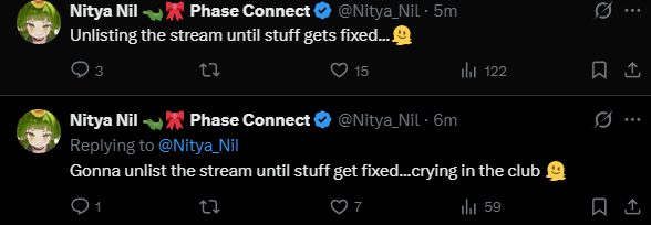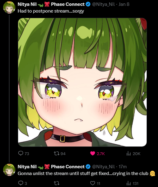 >>108461892stream might be delayed again unfortunatelyhttps://x.com/Nitya_Nil/status/2009647334125387902