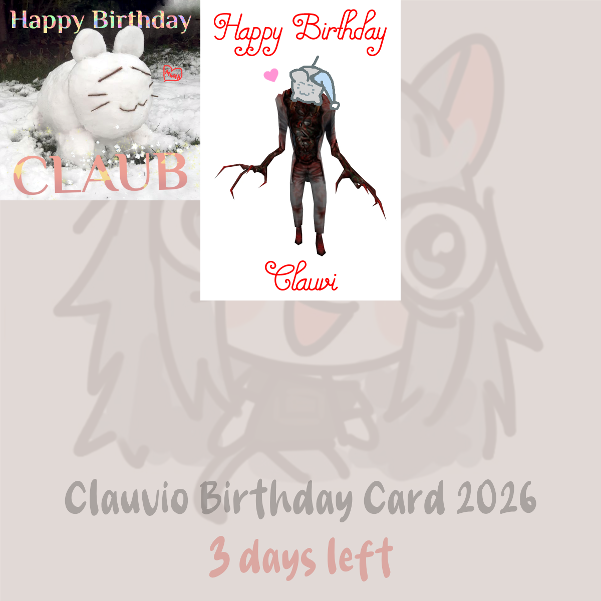 Less than 3 DAYS left for the Clauvi birthday card.Tile dimensions should be multiples of 200.Don't know what to draw? Just ask and idea guys will do what they do best.Things you could include:> Her friends Beri, Nino, Grimmi, Shady, Shimada> Retro games i.e. Sonic, Half Life, Earthbound> Weird or scary games i.e. Amnesia, Home Safety Hotline, VotV> Other games: UFO 50, Max Payne, friendslop> Cooking new recipes> Little outdoors adventures> Romance manga> Metal and Math RockReferences: https://mega.nz/folder/dq81lKrY#8W79Dt6mK0-xJHiwn3lcmQ