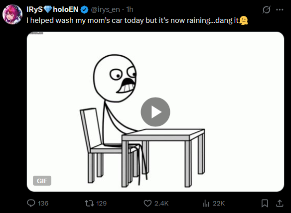 I asked for this once before with kronii but can I get IRyS washing a car in a driveway?Preferably with jean shorts and a loose fitting tanktop that shows sideboob/nipples - then eventually completely toplessmany thanks
