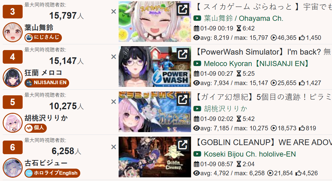 *GENERAL NUMBERFAG SITES*>https://playboard.co/en/>http://ikioi-ranking.com/>https://vrabi.net/>https://www.vstats.jp>https://live-ranking.userlocal.jp/vtuber-ranking>https://vt.poi.cat/Hololive sites>https://www.hololyzer.net/youtube/index.html>https://trackholo.live/en/>https://holo-spotify-stats.jirikunes.eu/Twitch sites>https://sullygnome.com/>https://twitchtracker.com/>https://stats.roki.sh/>https://streamscharts.com/