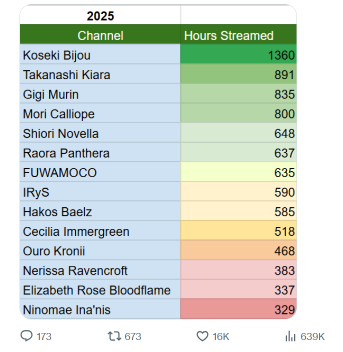 >>108456563Vstats post is not an all holoen comparison one the chart was all 17 holo talents stream hour comparison. I am pretty sure some dumb fuck Manager might have shown it to upper management and talked about how this person is doing bad streaming wise