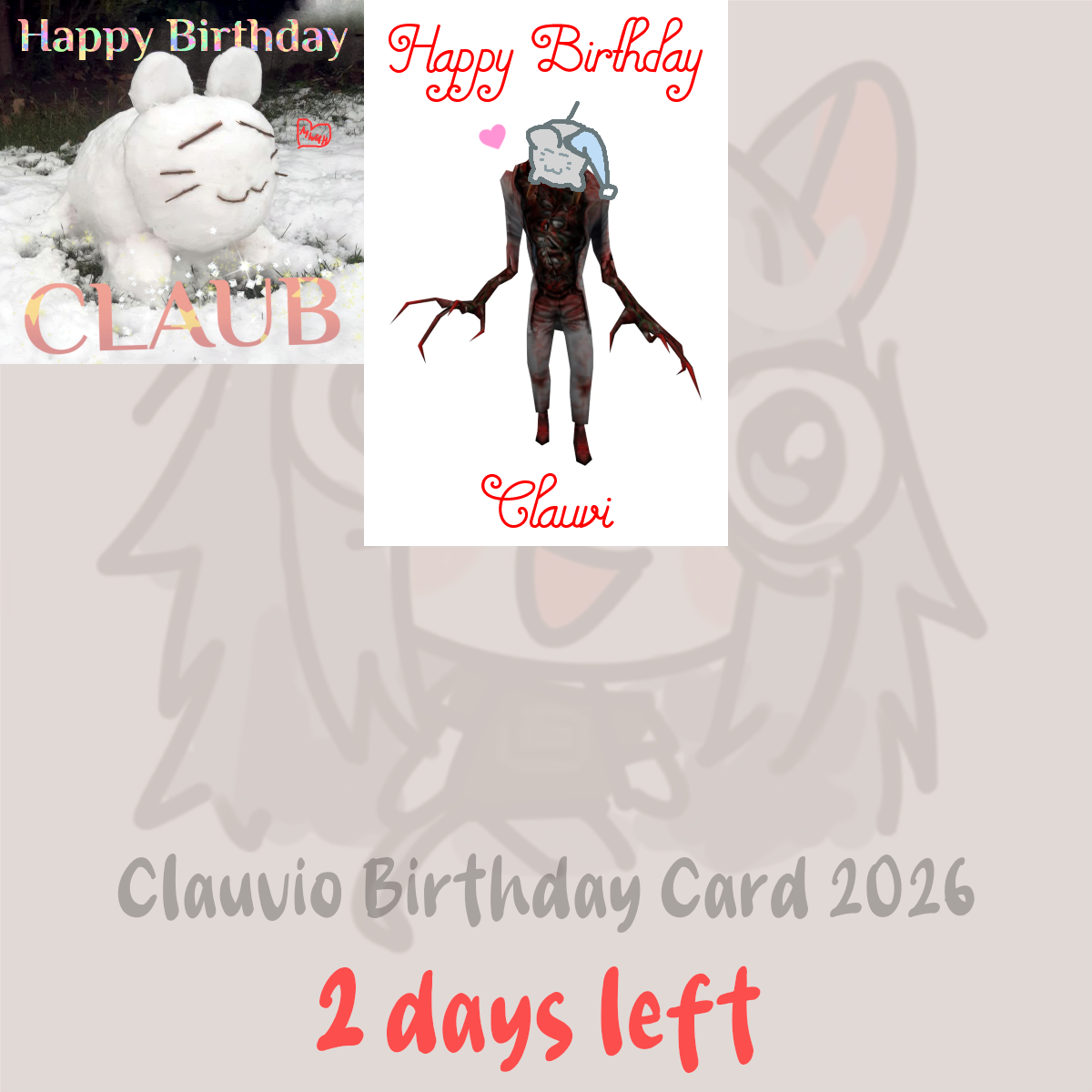 Clauvio's birthday is on Sunday (Jan 11) and we're making a card for her.TWO (2) DAYS remain to make a tile, the dimensions of which should be divisible by 200.Things you could include:> Her friends i.e. Beri, Nino, Grimmi, Shady, Shimada> Retro or weird/horror games she played, such as Sonic, VotV, Earthbound, Max Payne> Cooking new recipes> Little outdoors adventures> Romance manga> Metal and Math RockReferences: https://mega.nz/folder/dq81lKrY#8W79Dt6mK0-xJHiwn3lcmQ