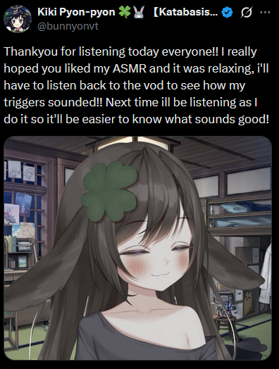 >>108480902Sweet caring rabba / 10I'm glad Kiki ASMR is a thing once again. It was soo much better compared to the previous ones not that I didn't like those, the 3Dio was a good investment. I'm looking forward to more cute Kiki noises