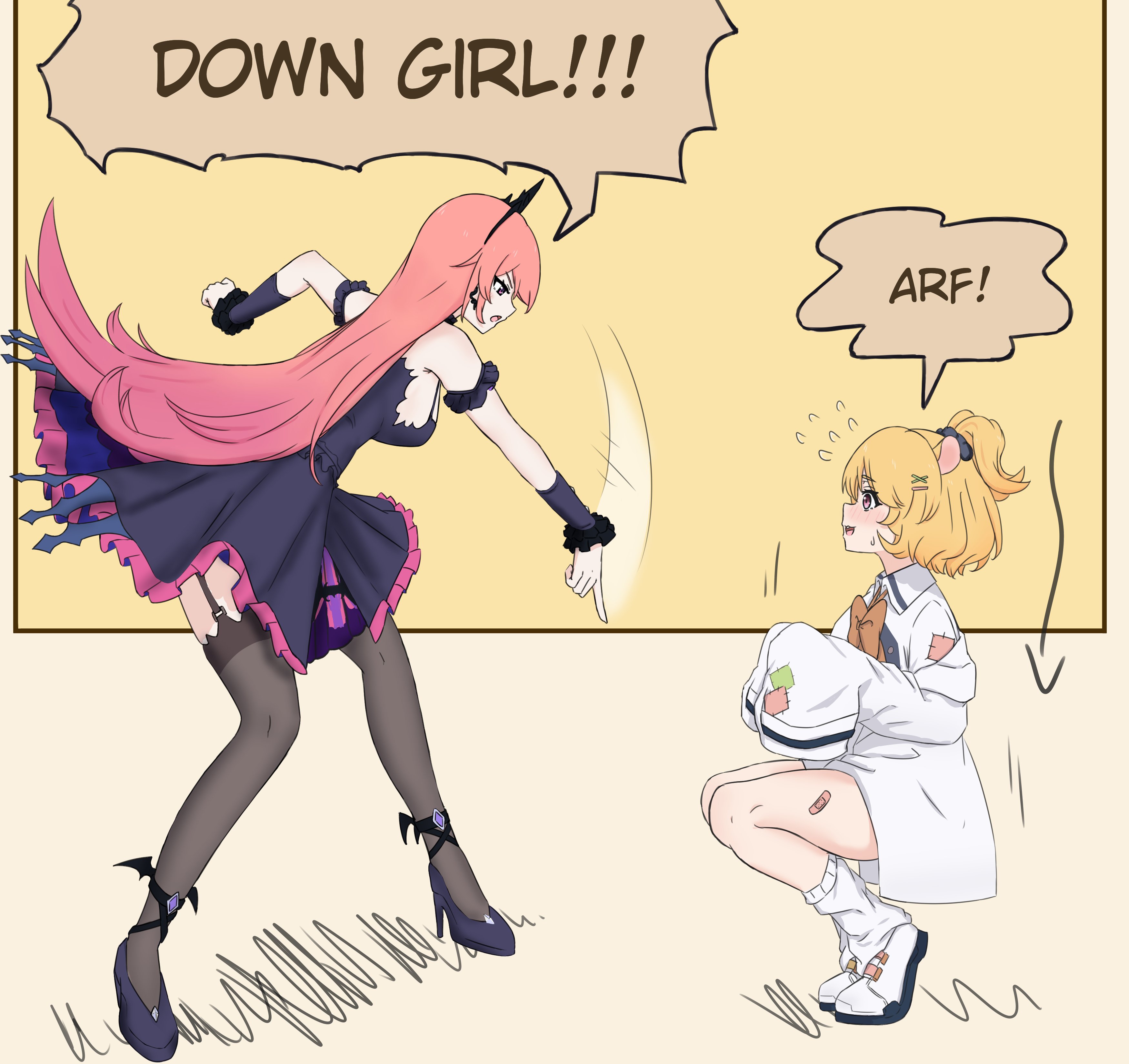 >fully clothed mina>naked except for collar bibi>walkies