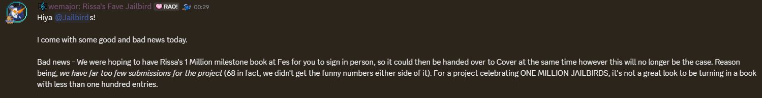 You know everyone is quick to label people who criticize her as Antis but these so called "fans" have to be the biggest anti's ever. Canceling a book just because it didn't get enough "numbers" for submission? Discorders are all about themselves, it's like when the Discord Takos did the Times Square Ina ad, not only was it something that didn't fit her at all, but the QR code lead immediately to a self aggrandizing speech and link to the Discord, I think it was only until the 2nd paragraph that they mentioned Ina at all. Is 68 messages not enough to make a pretty thick book already? It's more than she's going to read anyways, if they had hundreds, how big would that book read? The way they say it too, they're completely number obsessed so they cancel the project outright because it would "look bad". How does nothing look then? But as long as they blindly praise her on Twitter, I guess they're real fans right? Fuck me for wanting to hear the Demon of Sound do karaokes and output music somewhat consistently.