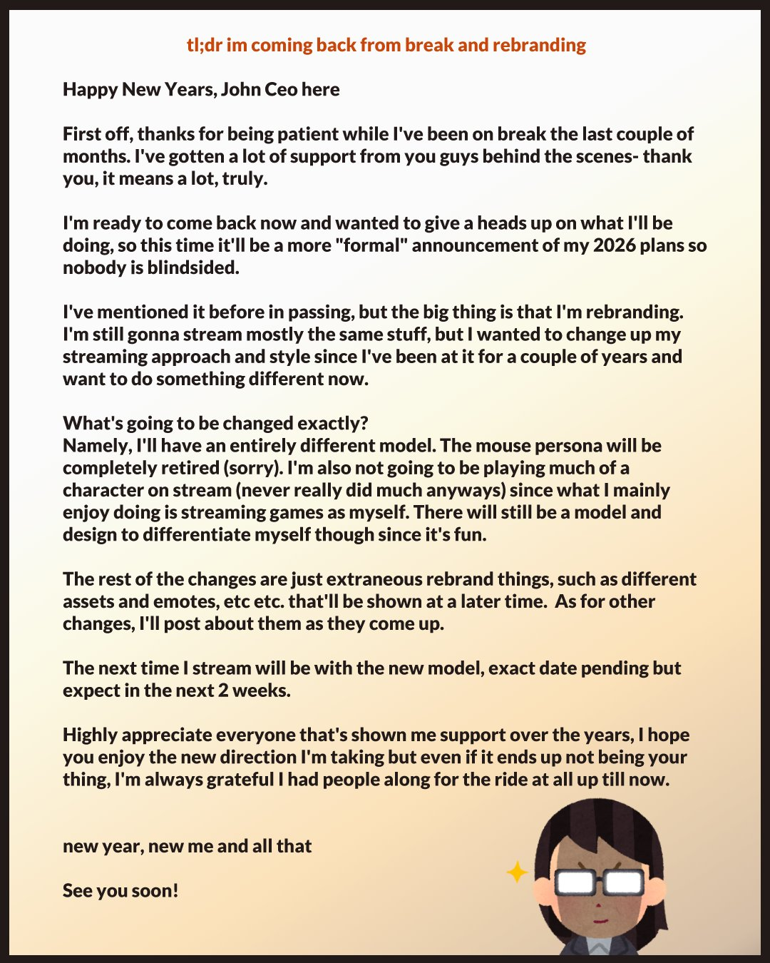Average Ligger Occupation Edition >What is /lig/?/lig/ is a thread for viewers to find, share, and discuss indie vtubers who have on average 500 viewers or more.>Why /lig/?Large indie vtubers have more net fans, but they are outnumbered by 2views by the thousands. This is a thread for the VIP, regardless of what language they stream on.>Can I shill my 499view oshi here?Considering averages fluctuate widely, all the way down to 100 is reasonable. The minimal requirement however is being Twitch partner or the YouTube equivalent in numbers.>Wait isn't that one a corpo?/lig/ is a thread for chuubas of a decent size who aren't defined by their corporate branding, either due to the small size of the corporation or the independence and lack of oversight granted to the talents>/lig/ Numbershttps://lignumbers.neocities.org/>Twitch Clips Guidehttps://pastelink.net/34vd5>VOD Archival Guidehttps://rentry.org/Vod_Archival_Guide>/lig/ VOD Archivehttps://rentry.org/Indie_Vod_Archives_lig>Koikatsu cardshttps://mega.nz/folder/JYtkXJwL#07gAQCQqI_9FsmX9oQJKSA>/lig/ Wheel of Nameshttps://wheelofnames.com/49w-z2x>Tiermakerhttps://tiermaker.com/create/-lig--16586688-3>/lig/ Chuuba Birthday Calendar (WIP)https://www.canva.com/design/DAE-XgWodVg/ofLz4QC1yPPQ4T6TTAE0fw/edit?utm_content=DAE-XgWodVg>Upcoming BirthdaysJanuary 14th - Shimada TigerJanuary 22nd - Lily HopkinsJanuary 24th - YuzuJanuary 25th - /lig/February 4th - Matara KanFebruary 5th - Bodega RatFebruary 9th - Meat & wwParasiFebruary 14th - ReiyuguiguiFebruary 15th - SaaFebruary 18th - Moon JellyFebruary 22nd - HinaBoBina>OC material for the OPhttps://mega.nz/folder/IIVD1IaJ#cfsRhWdJvzneIoG8HZUPuw>/lig/booruhttps://ligbooru.moe/>Duckshttps://www.twitch.tv/dashducks (embed) (embed) (embed) (embed)Other useful threads:>>>/vt//big/>>>/vt//corpo/>>>/vt//choc/>>>/vt//flip/>>>/vt//haha/>>>/vt//indie/>>>/vt//mint/>>>/vt//swarm/>>>/vt//vrt/>>>/vt//xvsj+/Previous Thread: >>108524795
