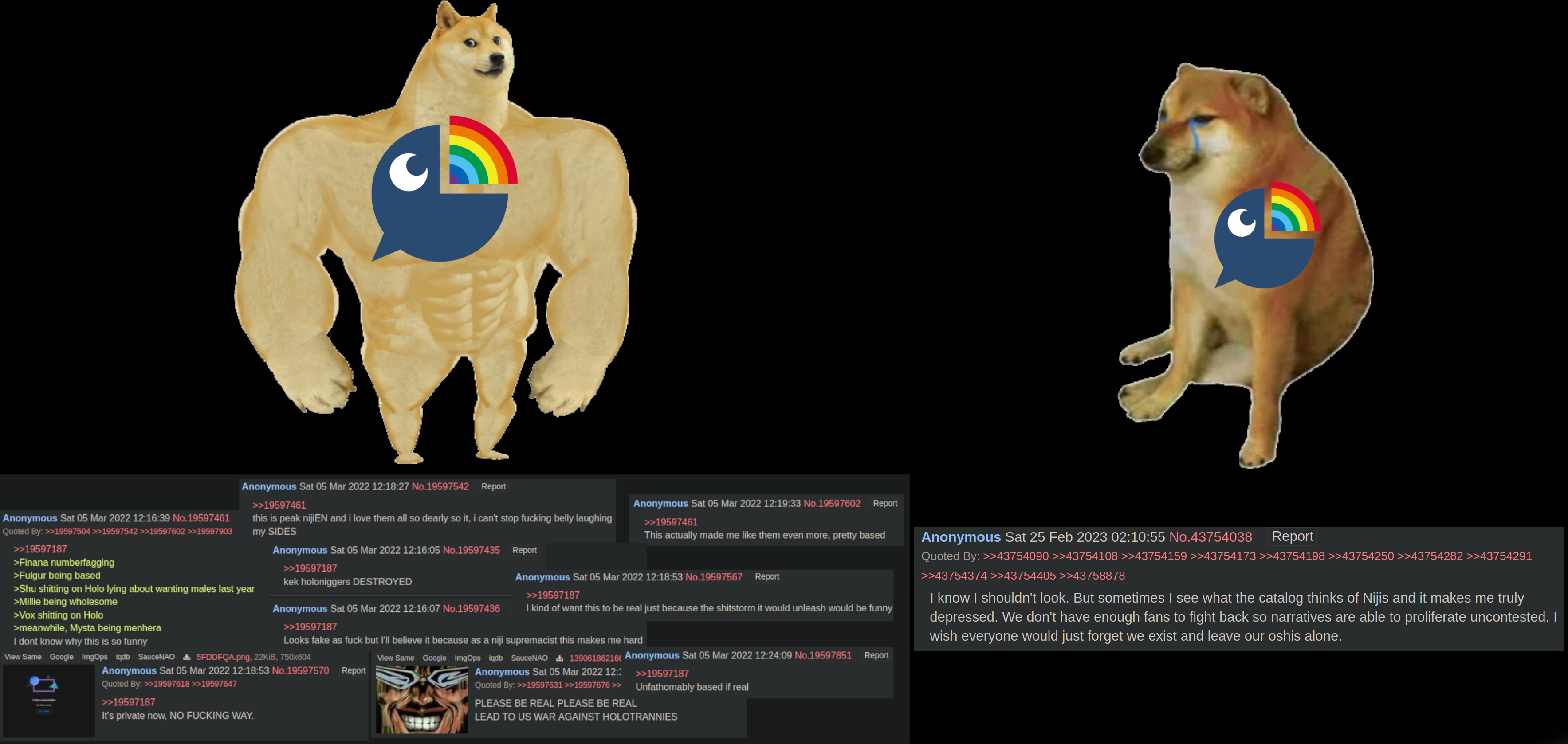 >>108540724>tweets from literal WHOs and known antisYup, it's not a yab. Feels good knowing chinks got outed for posting a lot of this too.Anyway niji lost 100k to their box last year, you might do better trying to prop them up by posting 24/7 because your strategy of concerntrolling Hololive for years hasn't worked.