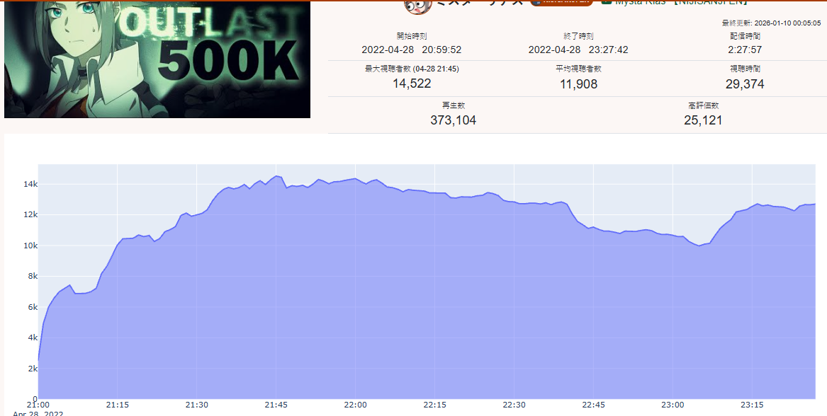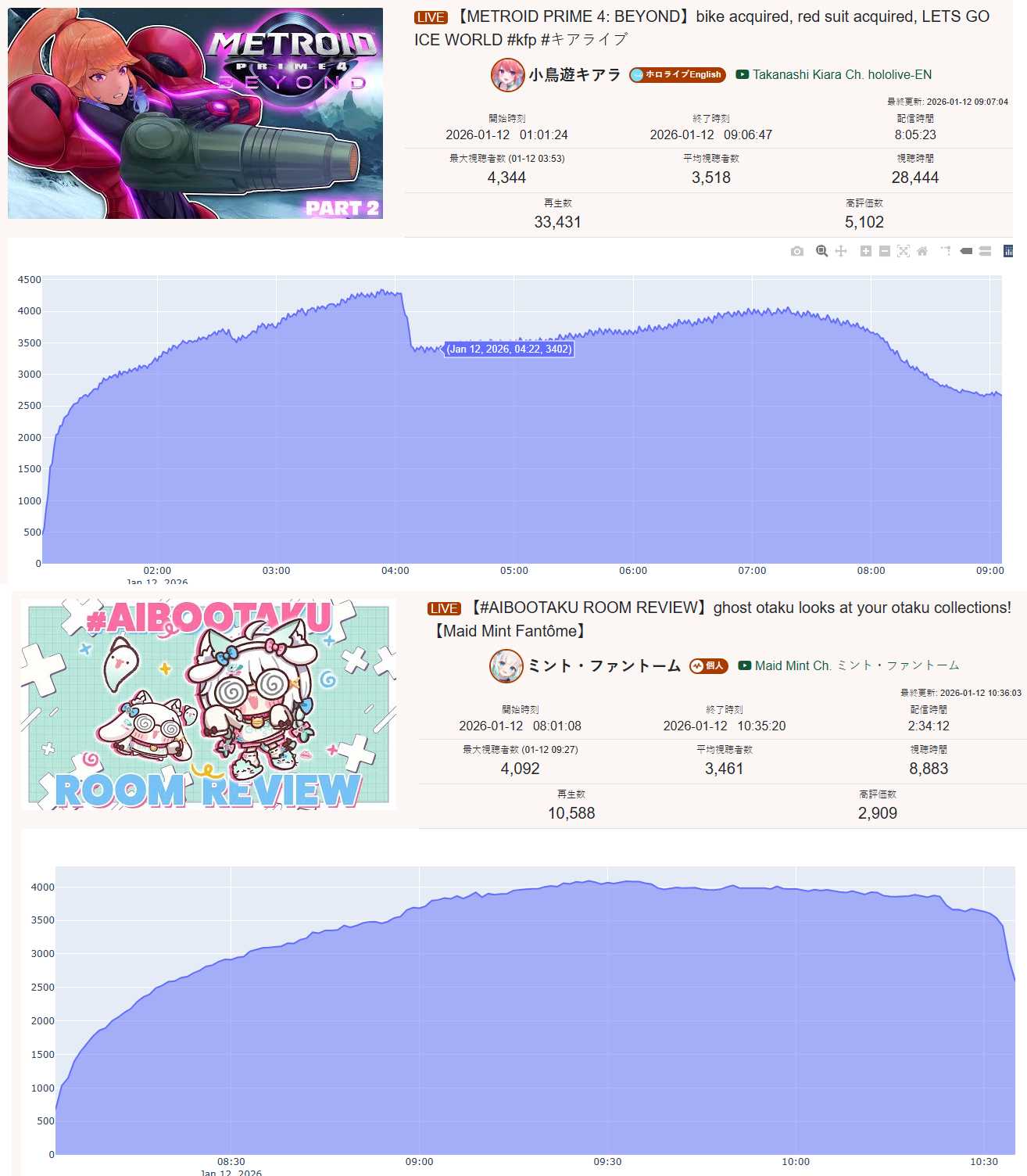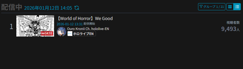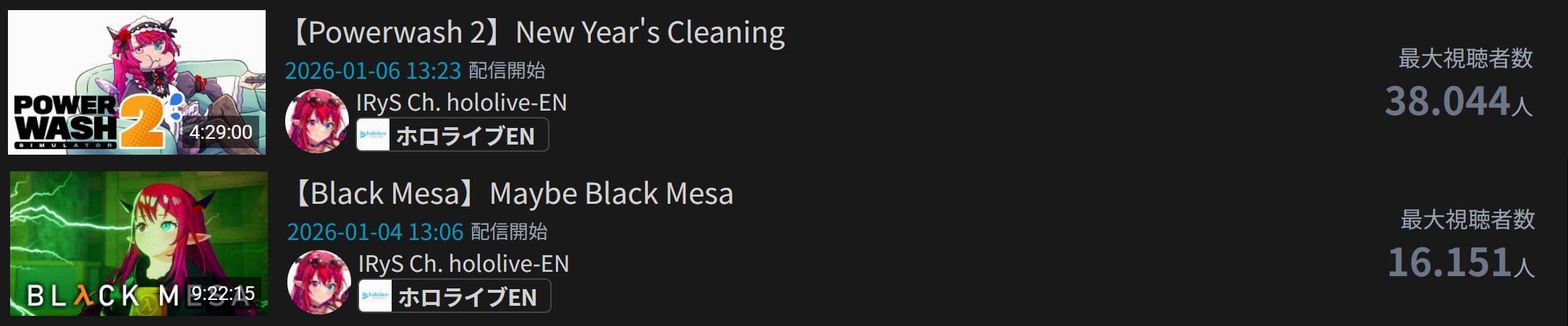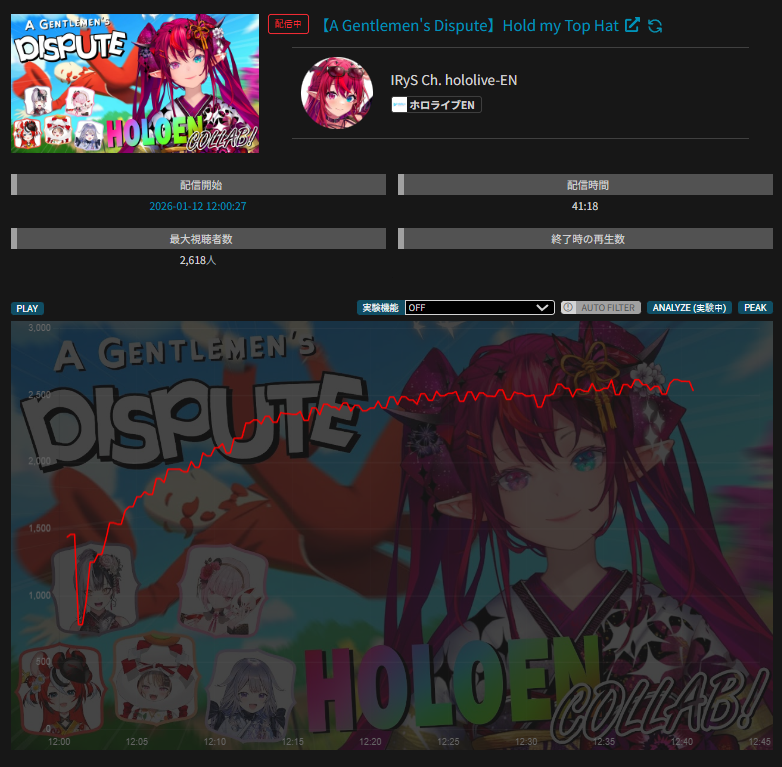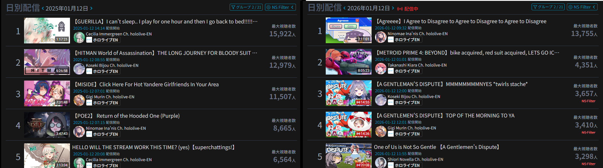 >>108534614JAN 2026 EN GOLD1/1 - IRyS - Unarchived Karaoke Relay: 22,4071/2 - Zotto - 3D Live: 18,3301/3 - Raora - Return Stream: 16,8421/4 - IRyS - Black Mesa: 16,1511/5 - Bijou - Warframe: 13,2061/6 - Meloco - Agree: 49,5251/7 - Bijou - Warframe: 12,9081/8 - Gigi - Subnautica: 15,0101/9 - Meloco - Powerwash Simulator 2: 15,1471/10 - Bijou - Outfit Reveal: 25,6741/11 - Bijou - Dark Souls 3: 17,344PER COMPANY8x: Hololive English3x: Nijisanji EnglishPER STREAMER4x: Bijou2x: IRyS, Meloco1x: Gigi, Raora, Zotto