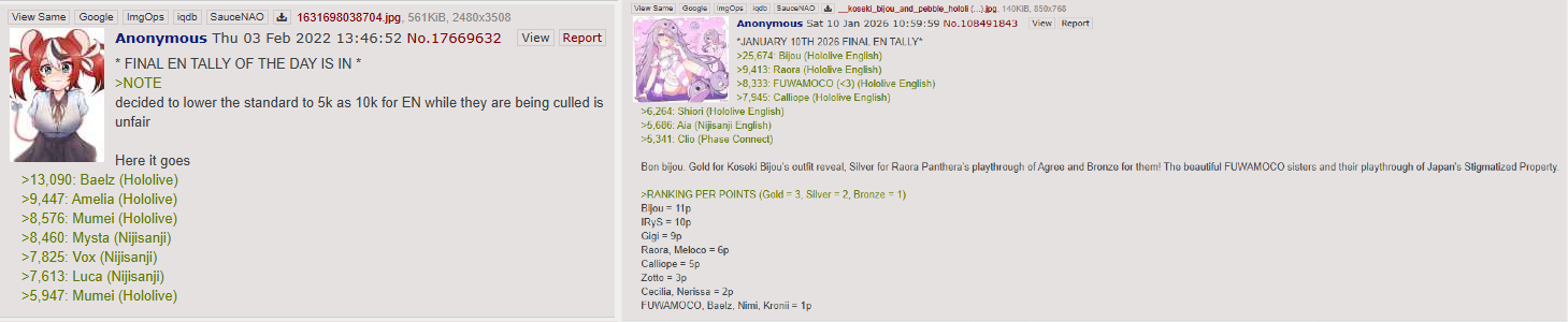 >>108534087In regards to the EN Tally, I think it went something like this.>First EN Tally Mostly a meme, made only to brag about Luxiem's early success, December 2021-March 2022>Second EN TallyIRyStocrat, Chinese flag whenever NijiEN won Gold, hilariously tribalistic, did not count Zs which led to shit like the June 2022 tally, March 2022-February 2023>Third EN TallyIRyStocrat, mostly neutral in regards to the tally itself, laid most of the rules that the EN Tally uses today, had to deal with Ennacuck, added Indies to the tally, February 2023-April 2025>Fourth EN TallyRuffian...and I think that's it. July 2025-Today