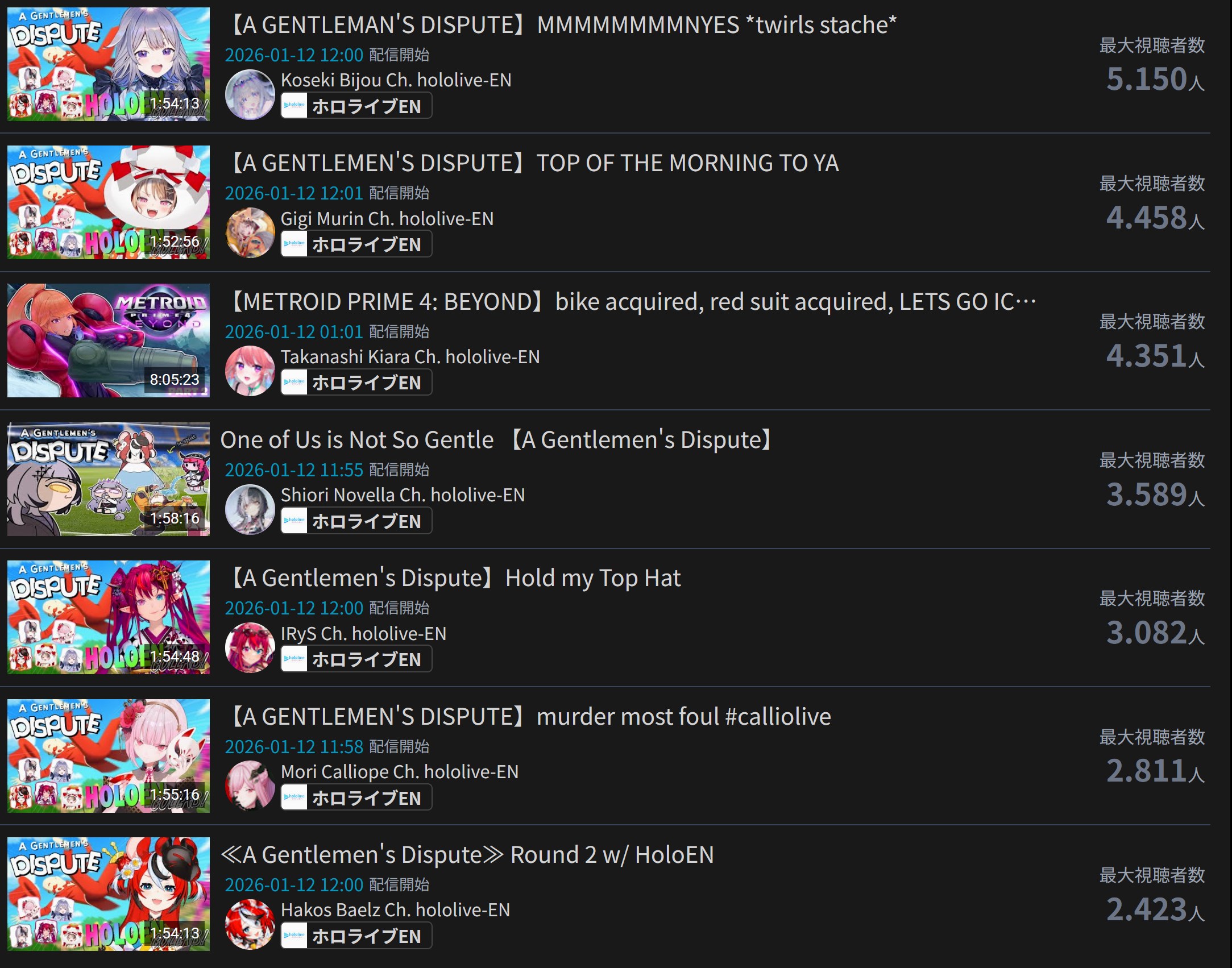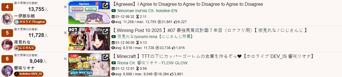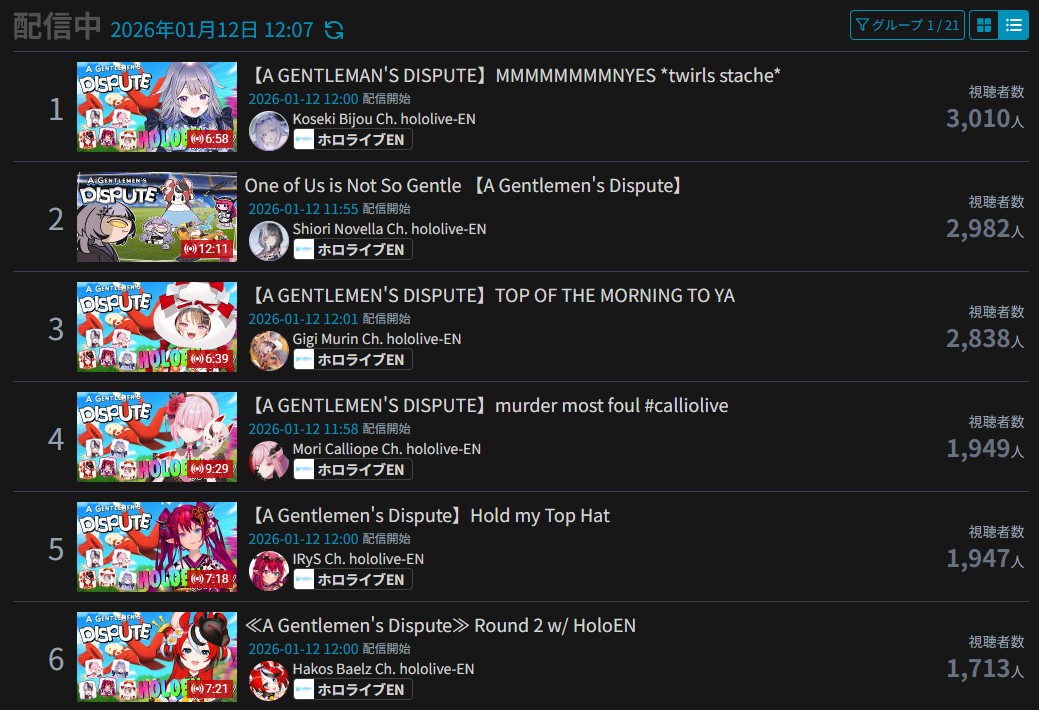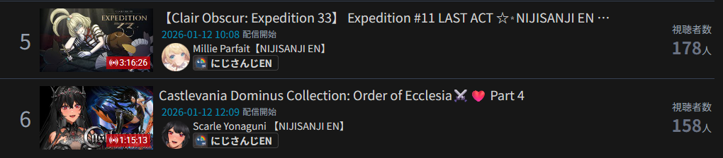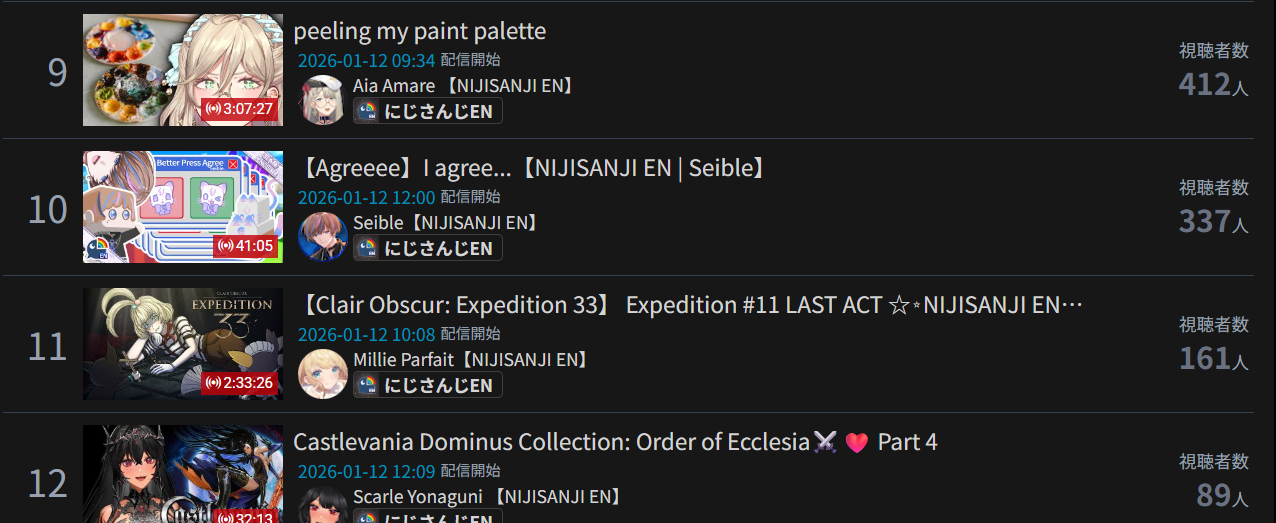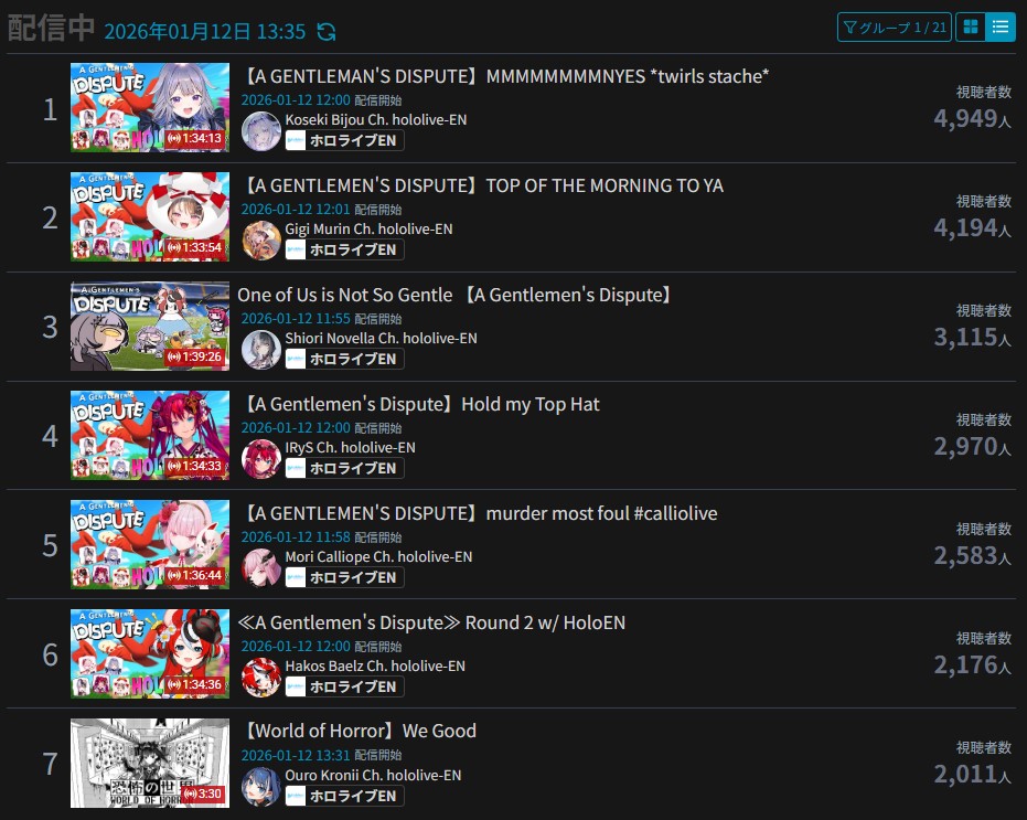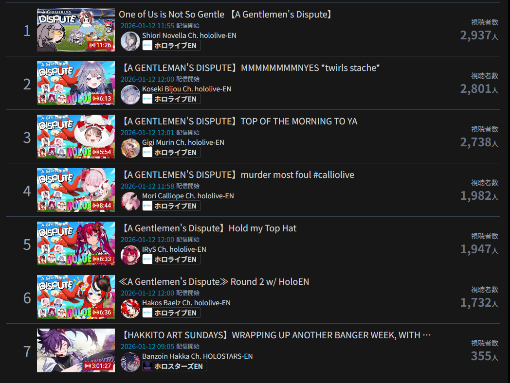*JANUARY 11TH 2026 FINAL EN TALLY*>17,344: Bijou (Hololive English)>12,345: Calliope (Hololive English)>7,358: Meloco (Nijisanji "English")>7,286: Kiara (Hololive English)>5,994: FUWAMOCO (<3) (Hololive English)>5,983: Zeal (Nijisanji English)>5,377: Vantacrow (Nijisanji English)Second in a row. Gold for Koseki Bijou's playthrough of Dark Souls 3, Silver for Calliope's drinking stream alongside Kobo and Kanade, Bronze for クズハの豚娼婦 with Powerwash Simulator 2.>RANKING PER POINTS (Gold = 3, Silver = 2, Bronze = 1)Bijou = 14pIRyS = 10pGigi = 9pCalliope, Meloco = 7pRaora = 6pZotto = 3pCecilia, Nerissa = 2pFUWAMOCO, Baelz, Nimi, Kronii = 1p