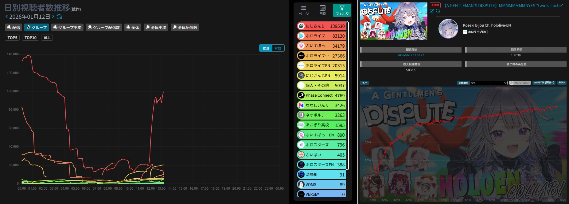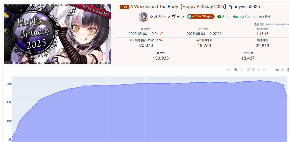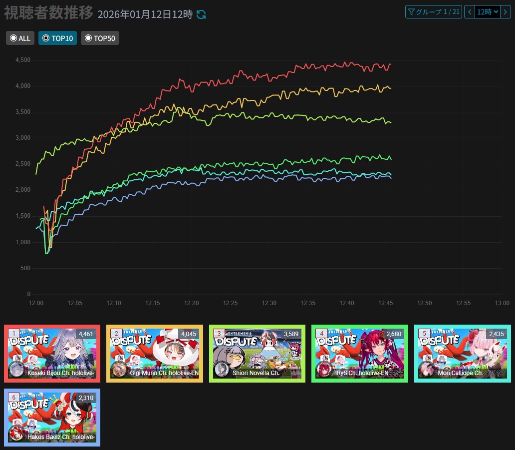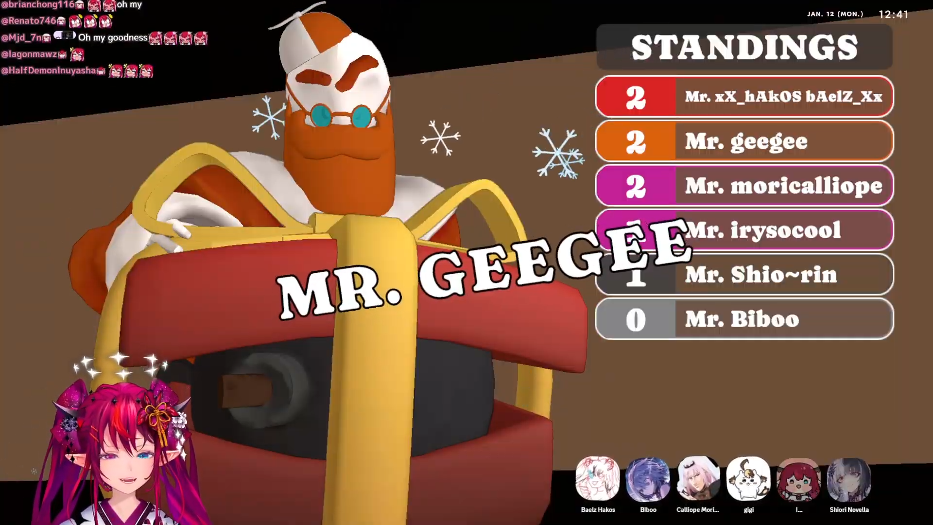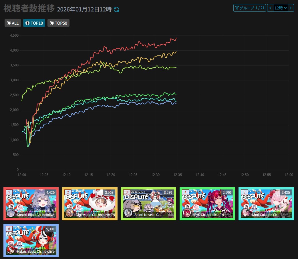 *JANUARY 11TH 2026 FINAL EN TALLY*>17,344: Bijou (Hololive English)>12,345: Calliope (Hololive English)>7,358: Meloco (Nijisanji "English")>7,286: Kiara (Hololive English)>5,994: FUWAMOCO (<3) (Hololive English)>5,983: Zeal (Nijisanji English)>5,377: Vantacrow (Nijisanji English)Second in a row. Gold for Koseki Bijou's playthrough of Dark Souls 3, Silver for Calliope's drinking stream alongside Kobo and Kanade, Bronze for クズハの豚娼婦 with Powerwash Simulator 2.>RANKING PER POINTS (Gold = 3, Silver = 2, Bronze = 1)Bijou = 14pIRyS = 10pGigi = 9pCalliope, Meloco = 7pRaora = 6pZotto = 3pCecilia, Nerissa = 2pFUWAMOCO, Baelz, Nimi, Kronii = 1p