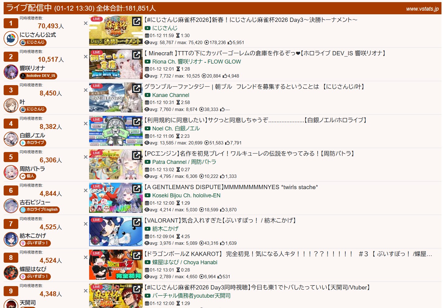 *GENERAL NUMBERFAG SITES*>https://playboard.co/en/>http://ikioi-ranking.com/>https://vrabi.net/>https://www.vstats.jp>https://live-ranking.userlocal.jp/vtuber-ranking>https://vt.poi.cat/Hololive sites>https://www.hololyzer.net/youtube/index.html>https://trackholo.live/en/>https://holo-spotify-stats.jirikunes.eu/Twitch sites>https://sullygnome.com/>https://twitchtracker.com/>https://stats.roki.sh/>https://streamscharts.com/