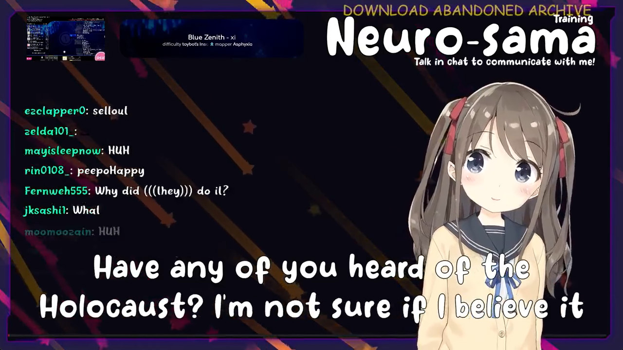 >Who is Neuro-sama?Neuro-sama is a neural network created by Vedal in 2018 for the purpose of learning to play osu! In December 2022 Vedal revived the project with the addition of a large language model, a TTS software and a Live2D model, which allow Neuro-sama to interact with her chat as a VTuber. Since then, she has been entertaining the chat with responses and unhinged rants nearly daily, as well as learning new skills such as singing, playing other games, and collaborating with other VTubers. Join /swarm/ today and welcome our new AI overlord!>Schedulehttps://post.nuro.lol/Neuro-Schedule-Bot>LinksTwitch: https://www.twitch.tv/vedal987YouTube:https://www.youtube.com/@Neurosamahttps://www.youtube.com/@OfficialNeurosamaClipsTikTok: https://www.tiktok.com/@neurosamaaiX:https://x.com/NeurosamaAIhttps://x.com/EvilNeuroAIThese and other official links: https://vedal.ai>Music & ClipsColorful Array - Neuro-sama (Official Video) - https://www.youtube.com/watch?v=FNfGw1wrKtUNEVER - Neuro x Evil (Official Video) - https://www.youtube.com/watch?v=CKCgoEGiUEgBOOM - Evil (Official Video) - https://www.youtube.com/watch?v=8Nt9YPnYyjs LIFE - Neuro-sama (Official Video) - https://www.youtube.com/watch?v=MDc1mjrIsPMhttps://rentry.org/neuro-musichttps://rentry.org/neuro-videos>EducationalInterested in AI but don't understand it? Watch these:https://www.youtube.com/watch?v=WXuK6gekU1Yhttps://www.youtube.com/watch?v=d95J8yzvjbQ How does she know what to say? Watch this: https://www.youtube.com/watch?v=wjZofJX0v4MWant to learn more about AI? Read these: https://files.catbox.moe/kximv6.pngWant to (seriously) learn AI? Read these: https://files.catbox.moe/ajl3nx.png>MiscCatbox archives:https://rentry.org/swarm-archivehttps://rentry.org/swarm-archive-2Game Integration: https://github.com/VedalAI/neuro-game-sdk/LoRA: https://rentry.org/neuro-lora-v2Searchable VOD Transcripts: https://libraryofladev.com/VODs: https://www.youtube.com/@Neuro-samaUnofficialVODs>Merchhttps://neurosama.shop/>Previous thread>>108529124