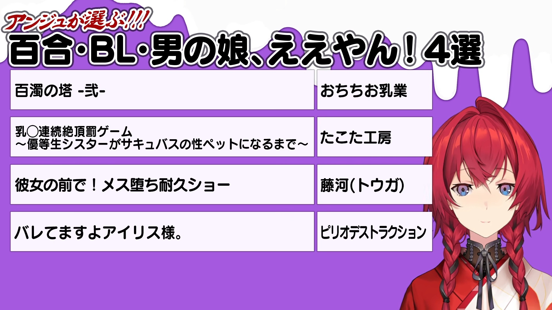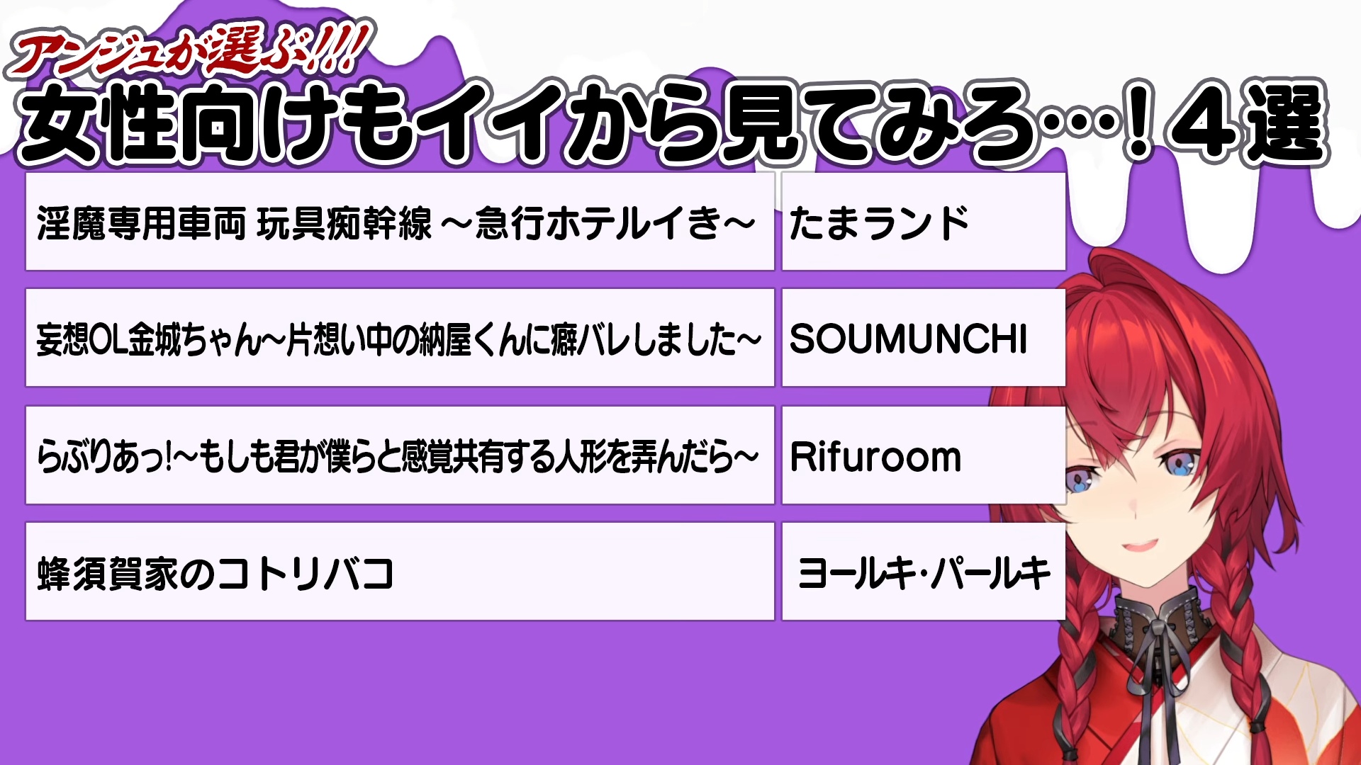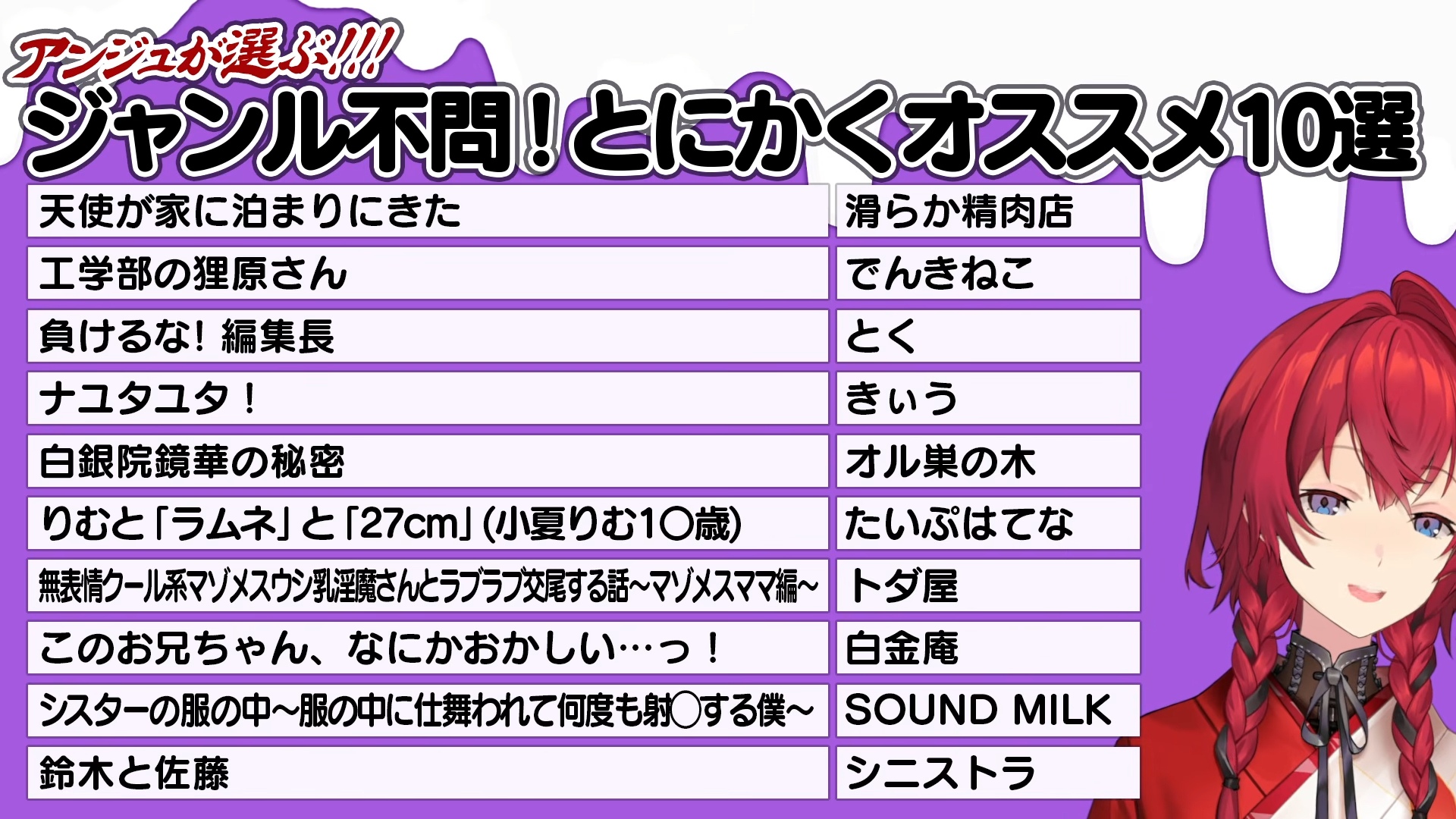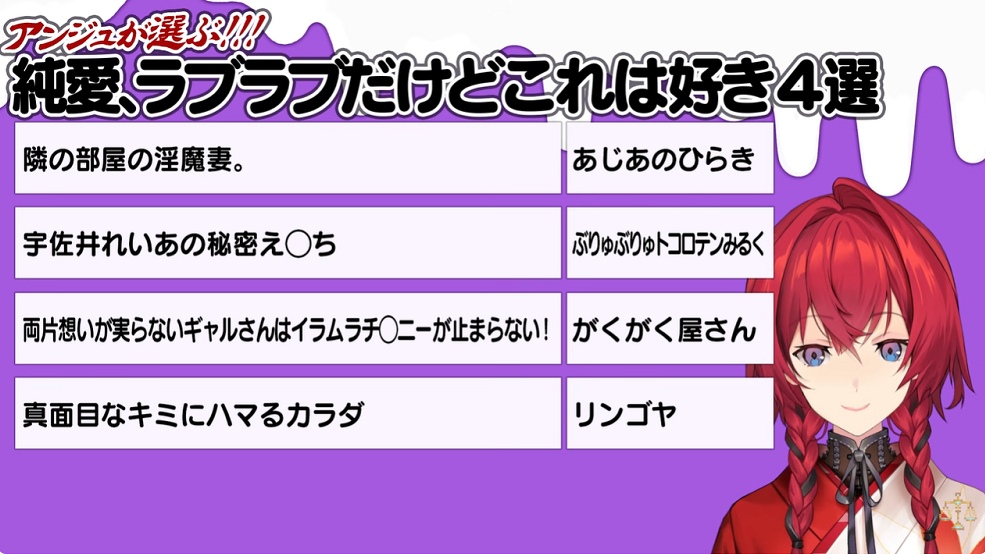 All the dlsite RJs for the Ange stream in order. I didn't double check them.NTRRJ01085000RJ01168984RJ01211213RJ01430792RJ01417312RJ01225097RJ01168382RJ01367952RJ01380796RJ01535626vanillaRJ01537086RJ01494694RJ01373608RJ01422873BLRJ352053RJ01452064RJ01356739RJ01335224Inhuman&TentaclesRJ01502612RJ01475464RJ01495416RJ324926RJ01428109RJ01423474RJ01384645RJ01369528RJ01326699RJ01414346TS&FutaRJ01521886RJ01474951RJ01457226RJ01314328For WomenRJ01145768RJ01261931RJ01331671RJ01187211No GenreRJ01415426RJ01406317BJ01942054BJ02023274BJ01719875RJ01532918RJ01411632RJ01411106RJ01532041RJ01491999