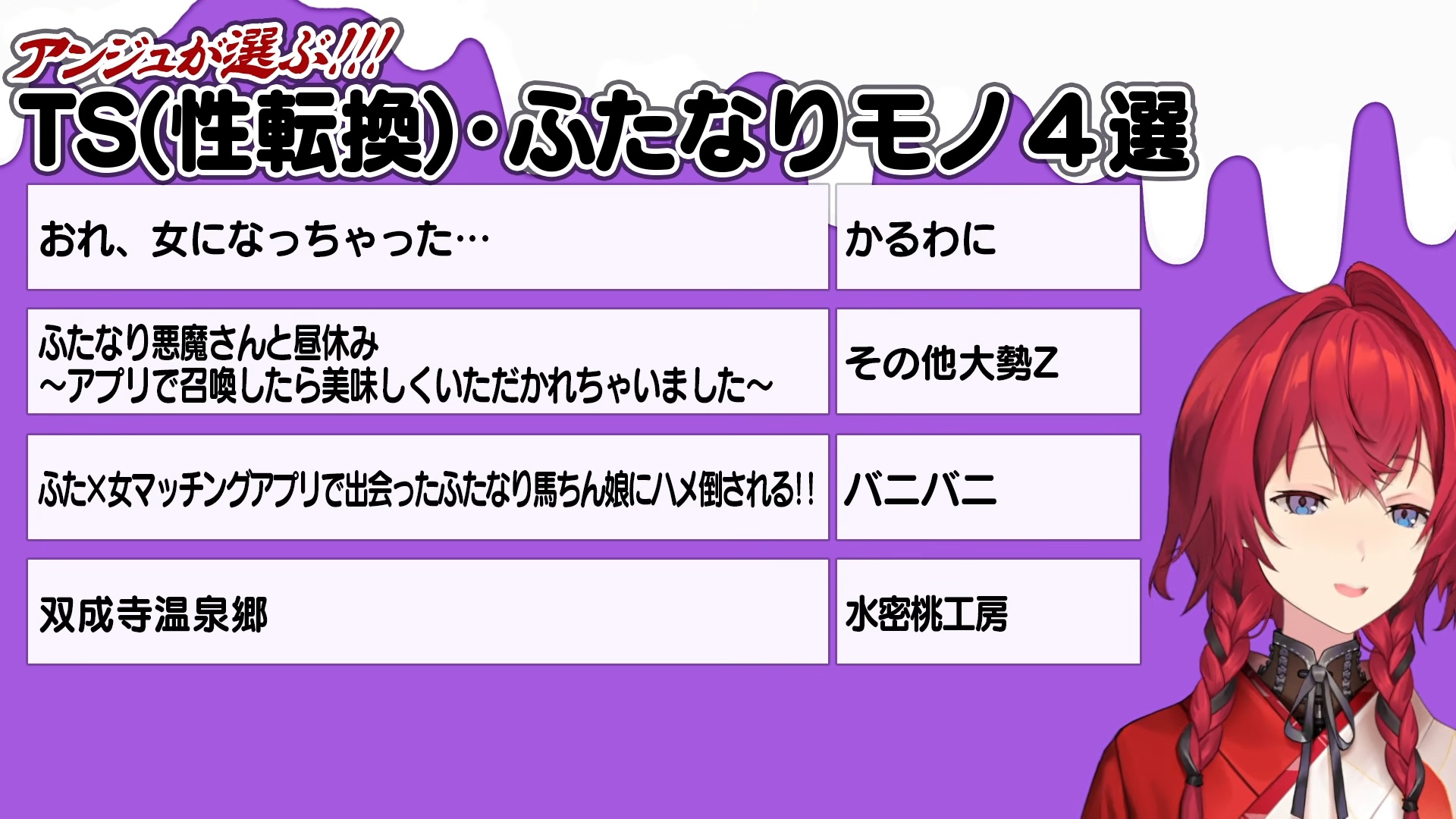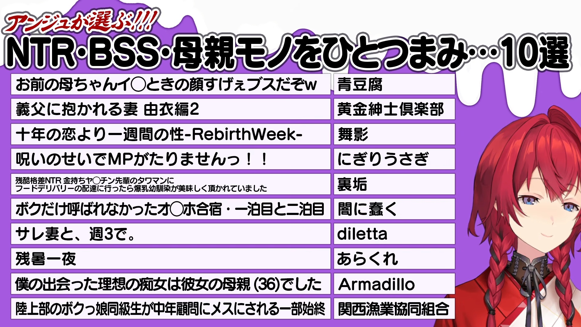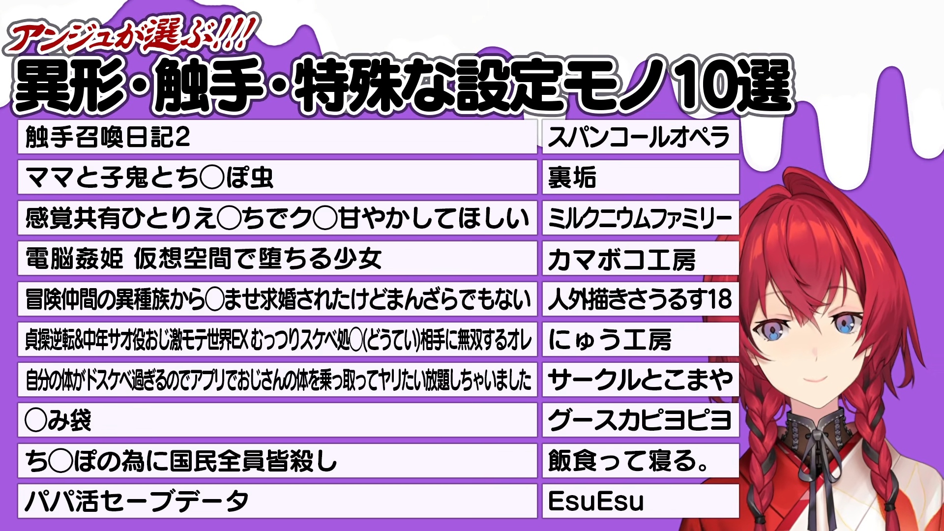 All the dlsite RJs for the Ange stream in order. I didn't double check them.NTRRJ01085000RJ01168984RJ01211213RJ01430792RJ01417312RJ01225097RJ01168382RJ01367952RJ01380796RJ01535626vanillaRJ01537086RJ01494694RJ01373608RJ01422873BLRJ352053RJ01452064RJ01356739RJ01335224Inhuman&TentaclesRJ01502612RJ01475464RJ01495416RJ324926RJ01428109RJ01423474RJ01384645RJ01369528RJ01326699RJ01414346TS&FutaRJ01521886RJ01474951RJ01457226RJ01314328For WomenRJ01145768RJ01261931RJ01331671RJ01187211No GenreRJ01415426RJ01406317BJ01942054BJ02023274BJ01719875RJ01532918RJ01411632RJ01411106RJ01532041RJ01491999