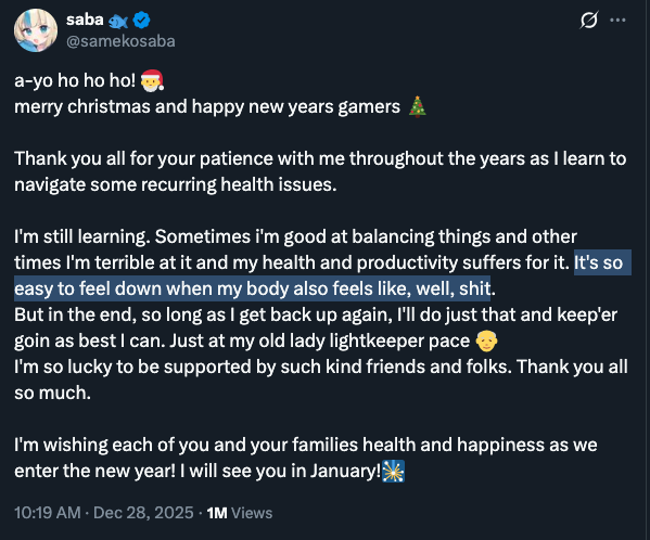 >>108565677>What kind of a health issue prevents someone from going live AT LEAST twice a week for about an hour/hour and a half just to shoot the shit with her fans and casually play some game in the background?Pregnancy and raising kids