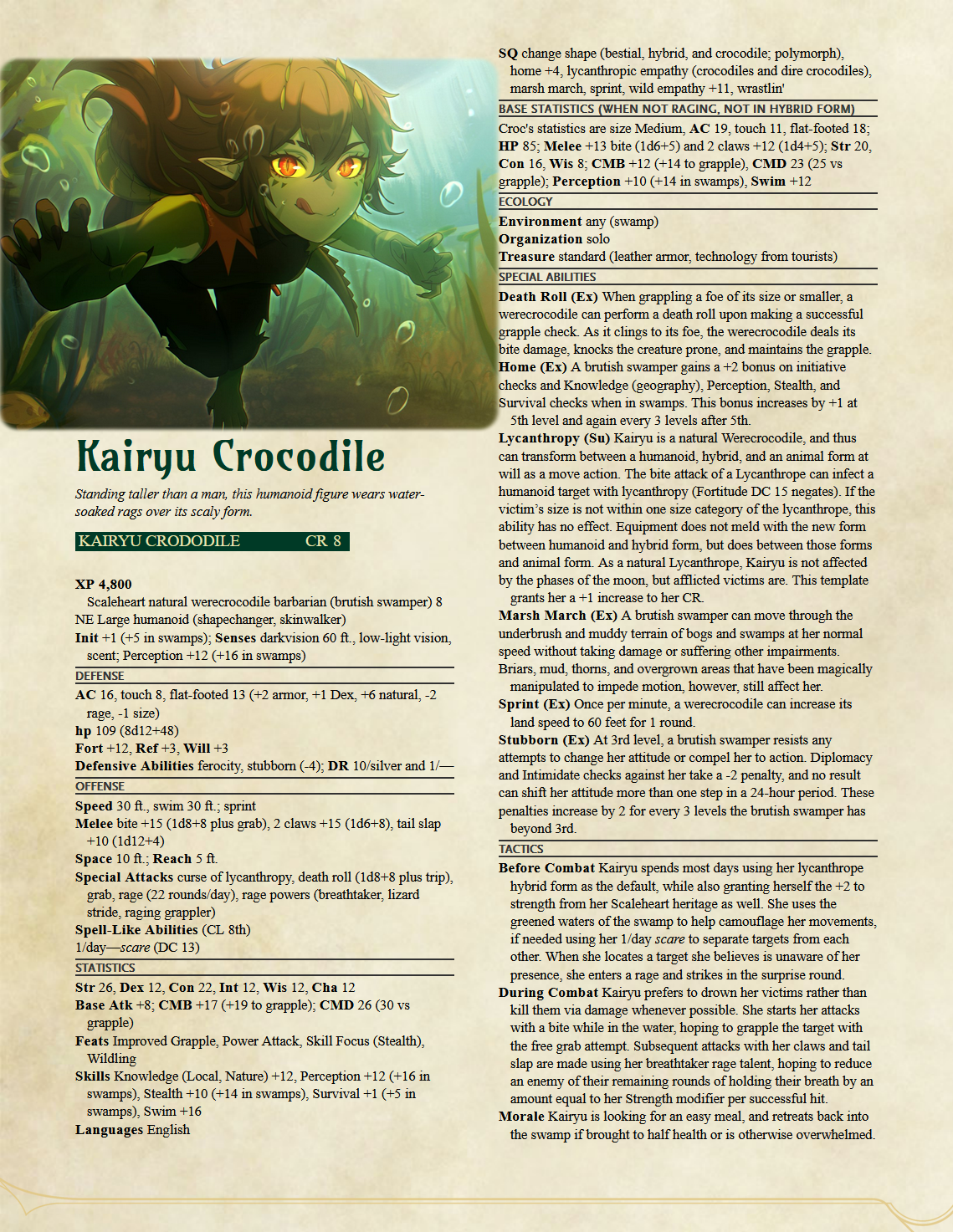 >>108588209I make these sheets by making as close to a circle between canonical lore and mechanical accuracy. The system I use, Pathfinder 1e, has Werecrocodiles, and Kairyu has shown (mostly through a chibi form but still) the ability to turn into a full croc form, which is what I took as the justification for the creature type. As for the bulletproof skin, that's easily justified by the DR/10, otherwise called Damage Reduction, which for the average handgun (usually calculated at a d6 damage die) will completely negate it by reducing that damage by up to 10 points.The rest of the build was basically built on the assumption that she does the standard crocodile maneuver of pulling someone into the water and then thrashing them about until they're dead, which this build does with frightening efficiency. So long as she's in a swampy environment, she'd be a truly fearsome foe to encounter for a low-to-mid-level party.>>108588216I do REALLY want to do something for Henya, the problem is that outside of her canonically being, quote, "a genius", unquote, she doesn't have a whole lot going on with what she can DO. I mean I can very easily just whip up a sheet of a character with as high of an Int score as I can legally make, but like, what else? It would feel a bit empty without more to go on.