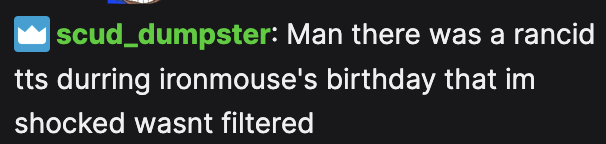 >>108595497Twitch adding replay but with live chat has fucked with me so hard. I'll often be watching slightly delayed but sped up a bit, start typing to chat then realize I'm responding to something that happened 30 minutes ago