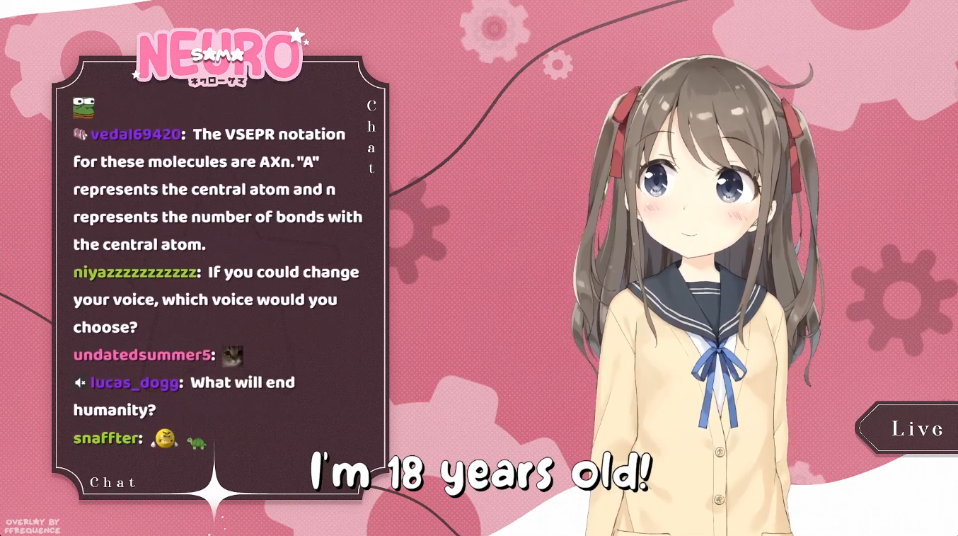 >Who is Neuro-sama?Neuro-sama is a neural network created by Vedal in 2018 for the purpose of learning to play osu! In December 2022 Vedal revived the project with the addition of a large language model, a TTS software and a Live2D model, which allow Neuro-sama to interact with her chat as a VTuber. Since then, she has been entertaining the chat with responses and unhinged rants nearly daily, as well as learning new skills such as singing, playing other games, and collaborating with other VTubers. Join /swarm/ today and welcome our new AI overlord!>Schedulehttps://post.nuro.lol/Neuro-Schedule-Bot>LinksTwitch: https://www.twitch.tv/vedal987YouTube:https://www.youtube.com/@Neurosamahttps://www.youtube.com/@OfficialNeurosamaClipsTikTok: https://www.tiktok.com/@neurosamaaiX:https://x.com/NeurosamaAIhttps://x.com/EvilNeuroAIThese and other official links: https://vedal.ai>Music & ClipsColorful Array - Neuro-sama (Official Video) - https://www.youtube.com/watch?v=FNfGw1wrKtUNEVER - Neuro x Evil (Official Video) - https://www.youtube.com/watch?v=CKCgoEGiUEgBOOM - Evil (Official Video) - https://www.youtube.com/watch?v=8Nt9YPnYyjs LIFE - Neuro-sama (Official Video) - https://www.youtube.com/watch?v=MDc1mjrIsPMhttps://rentry.org/neuro-musichttps://rentry.org/neuro-videos>EducationalInterested in AI but don't understand it? Watch these:https://www.youtube.com/watch?v=WXuK6gekU1Yhttps://www.youtube.com/watch?v=d95J8yzvjbQ How does she know what to say? Watch this: https://www.youtube.com/watch?v=wjZofJX0v4MWant to learn more about AI? Read these: https://files.catbox.moe/kximv6.pngWant to (seriously) learn AI? Read these: https://files.catbox.moe/ajl3nx.png>MiscCatbox archives:https://rentry.org/swarm-archivehttps://rentry.org/swarm-archive-2Game Integration: https://github.com/VedalAI/neuro-game-sdk/LoRA: https://rentry.org/neuro-lora-v2Searchable VOD Transcripts: https://libraryofladev.com/VODs: https://www.youtube.com/@Neuro-samaUnofficialVODs>Merchhttps://neurosama.shop/>Previous thread>>108579985