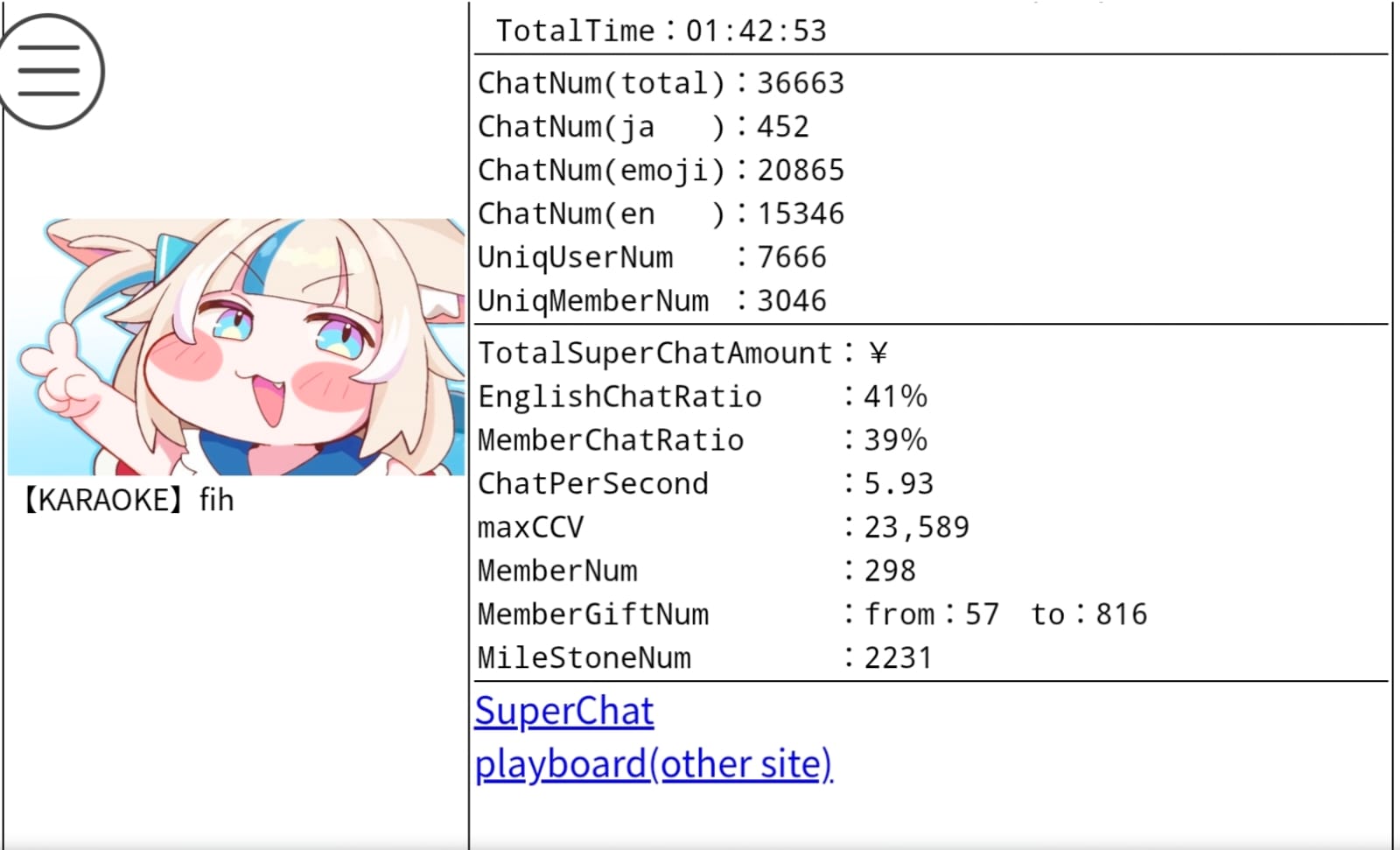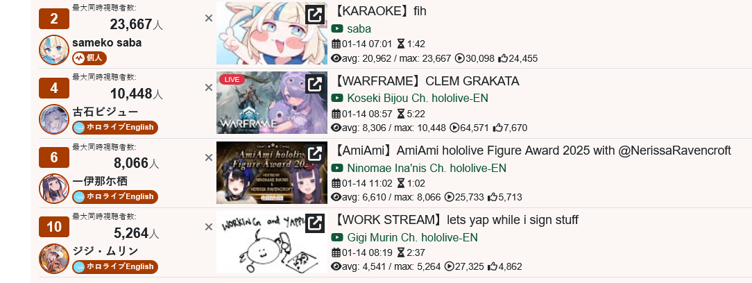 *GENERAL NUMBERFAG SITES*>https://playboard.co/en/>http://ikioi-ranking.com/>https://vrabi.net/>https://www.vstats.jp>https://live-ranking.userlocal.jp/vtuber-ranking>https://vt.poi.cat/Hololive sites>https://www.hololyzer.net/youtube/index.html>https://trackholo.live/en/>https://holo-spotify-stats.jirikunes.eu/Twitch sites>https://sullygnome.com/>https://twitchtracker.com/>https://stats.roki.sh/>https://streamscharts.com/