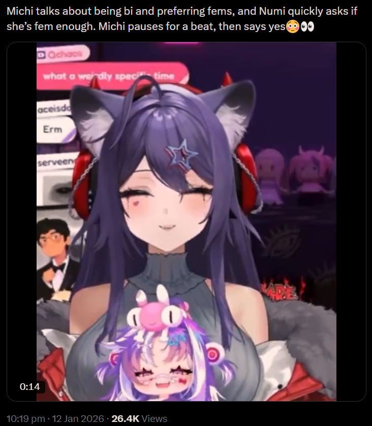 >>108594456>>108594466No, I really didn't know if she had ever collabed with a male (in my mind, when I say male, I mean male VTuber)