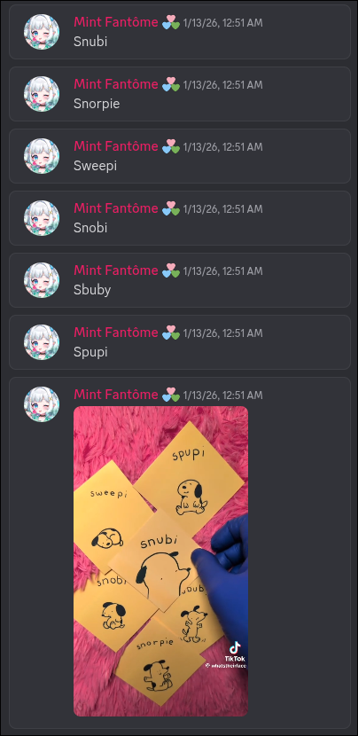 Tripping Hazard Edition>Her YouTubehttps://www.youtube.com/@mintfantome>Her Membershiphttps://www.youtube.com/playlist?list=UUMOcHHkJ98eSfa5aj0mdTwwLQ>Her Twitterhttps://twitter.com/MintFantomehttps://twitter.com/mintwooooo>Her Blueskyhttps://bsky.app/profile/mintfantome.ghostmaid.cafe>Twitter Spaces, Concerts, Conventions, etc.https://mega.nz/folder/f0MmFYRK#Sd2dbdggLSpw5rAs1SNY6ghttps://rentry.org/MintoConPart2>Unarchived Karaokeshttps://rentry.org/MintoKaraoke>Merchhttps://shop.moso.moe/mint-fantome/https://setsuna.pro/collections/mint-fantomehttps://setsuna.pro/collections/densetsu-exe>Gameshttps://mintfantome.itch.io/freak-or-treathttps://gioba-games.itch.io/fantome-no-nazohttps://gioba-games.itch.io/mintos-autocror3cthttps://gioba-games.itch.io/mint-n-friendshttps://ruzzfe.itch.io/second-button>Musichttps://www.youtube.com/watch?v=ccfSO2XJ67Yhttps://www.youtube.com/watch?v=Yj41JI-jmbshttps://www.youtube.com/watch?v=78NqcZGPfBUhttps://www.youtube.com/watch?v=quKNBWKmNH8https://www.youtube.com/watch?v=gz7xnpVB5OYhttps://www.youtube.com/watch?v=fnko4D9dQUghttps://www.youtube.com/watch?v=FT9IdLhAjLghttps://www.youtube.com/watch?v=EAwmnsxR1Lghttps://www.youtube.com/watch?v=4P3l3sTMYOwhttps://www.youtube.com/watch?v=dEj-WEGnx58https://www.youtube.com/watch?v=ke82vnl8_L0https://www.youtube.com/watch?v=UqI_a48RLj8https://www.youtube.com/watch?v=E2Y_Iv1P-t8https://www.youtube.com/watch?v=ExFMPZIK4pMhttps://www.youtube.com/watch?v=9-bXmJ9t5Zkhttps://www.youtube.com/watch?v=RsnpplOJ-vI>Our Divegrass teamhttps://implyingrigged.info/wiki//mint/Previous thread: >>108589192