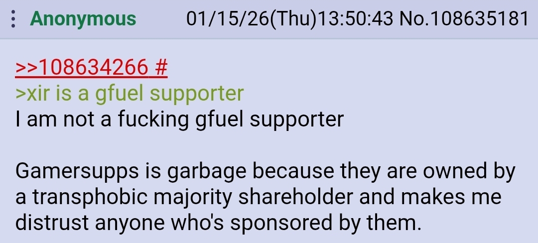 >>108635589>Gamersupps is transphobic Is this supposed to make me not like them?