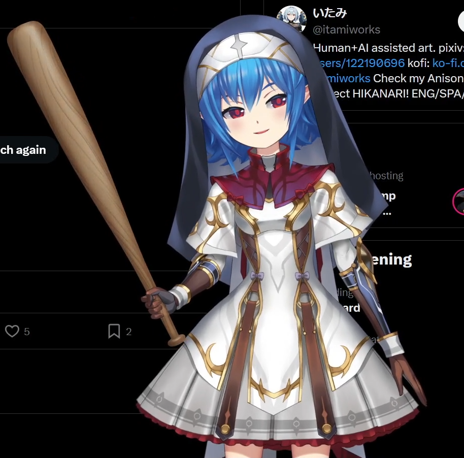 >>108645441This is her typical way of reasoning, if someone criticizes her, then she infinitely doubles-downs on that thing. She literally believes AI art is far better looking, more meaningful, and tells a better story and it makes me question her sanity.
