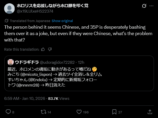 Japanese fans are vocal since Cover started deleting youtube videos that talk in detail about the PekoMiko breakup. Specifically, the ones that paint Miko in a bad light, while all the videos that are biased against Pekora are keept without problem. This only proves that the Miko is the one being favored by management, contrary to what this board believes. The japanese are starting to notice the obvious favoritism.https://x.com/V_Virgin_Mary/status/2011633403553296614https://x.com/rukiHime2/status/2011693111899206005https://x.com/yx_xxv/status/2011641888290586872