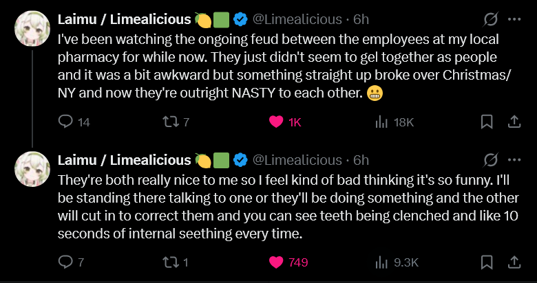 >>108640684My mother used to work at a pharmacy, the employees there were constantly at each others throats over petty shit for some reason.