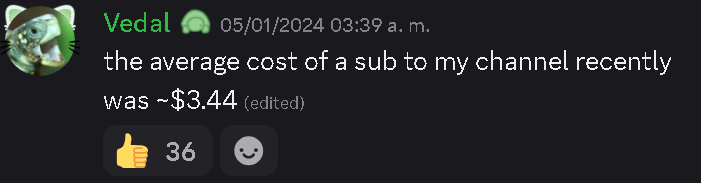 >>108646077im sure 3.5 was taking regional prices into accountbecause a sub in a normal country is above 5 dollars, idk if the twitch dashboard tells you that, but i remember vedal saying that number in the shitcord