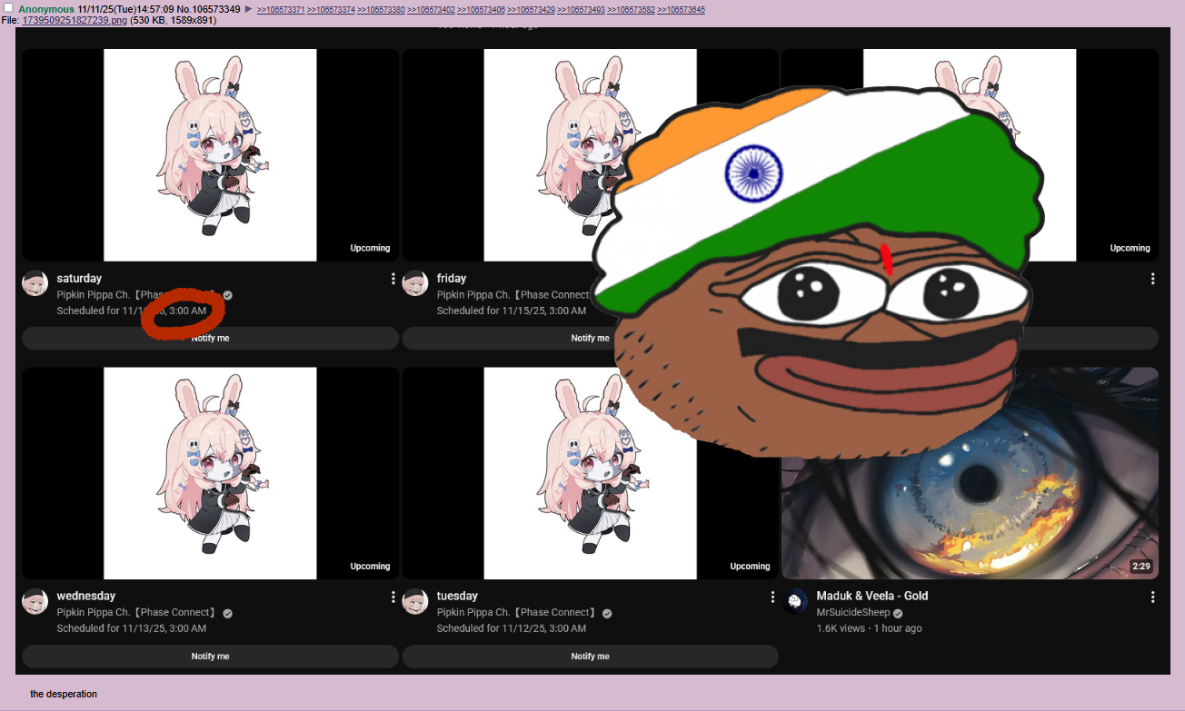 >>108649530>>108649488>>108649420Why do you care? You don't even watch Pippa. These random retards are living rent free in your head.
