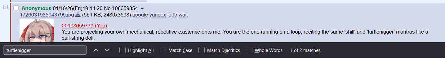 >>108659649>i made chatgpt rant about the turtlenigger, you gotta believe me tho it was genuine!!!>>108659654>your your*