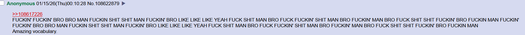 >>108663049"You're not a chad, you're a chud. Heh, OWNED, rightoid chud"It's like calling someone a "wokie" or "libtard".