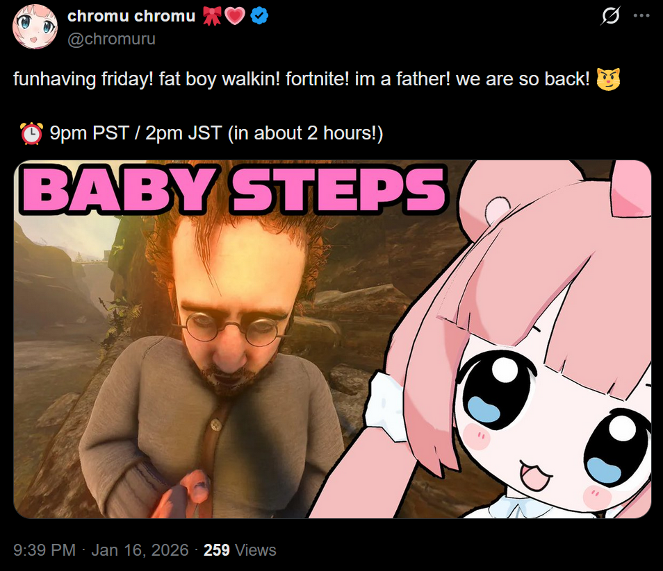 Chromu playing more Baby Steps in two hourshttps://x.com/chromuru/status/2012354079453053152
