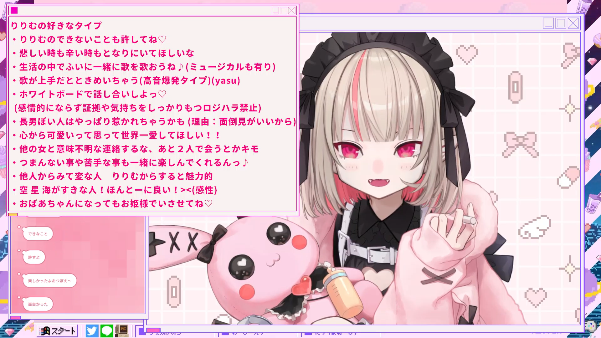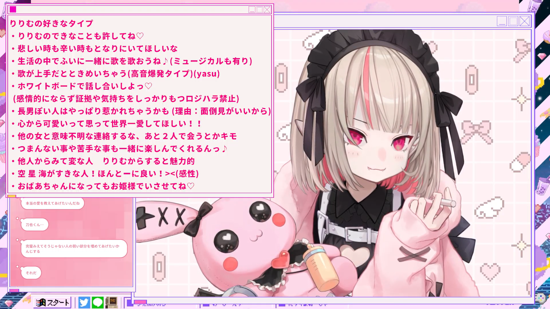 but next year maybe she wont do it her type of partner stream and list if it hasnt changed but this one for this year ririmu it changes a bit but its consistent at its core too she will post it too like the princess she is she told us ririmu she wants to date light yagami its the kind of 2D she likes its truly the best yea she wonder ririmu if light would start singing with ririmu if he would do that for her she like him but he would look down on her too because their deviate score its different their IQs are so different so even talking with him holding a conversation would be hard i wonder if ririmu would speak demonic language with light so yea he is smart and attractive that happens he has a pathetic side too at the very end she admires even if she is disrespect by him too so he is very arrogant and desperate pathetic moments too those are nice but riirmu also got ask what if light never picked the death note but ririmutold us that light in the alternate time line he never picked the tdeath note he was very kind its very different but that is because the original light exist that pick up the death note and that the one that got ririmu its the one that got the death note that made ririmu heart go crazy the light that didnt pick it up he just smart kind and care about his family its htat kind of person she also got told ririmu would get along better with ryuk than with light too some times ririmu looks at light like from the perspective of Ryuk like she is just observing its interesting to look at too just passive observer thinking that she read ririmu she got told what about L she said ririmu she doesnt have to be her maybe someone else but for L he seem like he would love someone for light real love is hard for him he suspects every thing any thing and any one light does yea so that happens but that get ririmu because she wants to change that she wants to teach him she also got ask if she like men that get her maternal instincts awake she think about that she has to talk about that she cant just ignore it she told us she its nice being needed by some one that is broken and stuff she finds value there being necessary for someone like that yea but ririmu dont feel like going to be happy she want to be happyyyyy ririmu wants to be happy happy ririmu likes people that makeririmu happy its weird if ririmu is not loved its not good ririmu was raised with much love from her family and love by every one and being so cute that she isnt loved its yea she wants to be happy and be with someone that makes her happy but seeking every thing from that from partner its not good ririmu thinks she got told she dont have eye for men maybe she doesnt and its just trash someone told ririmu maybe she be happier if she is the one being chased but even then ririmu wont fall in love necessarily ririmu will run away she doesnt like being chased she is bad at having affectino like that directed at ririmu she prefers to chase not be chased whenshe doesnt feel like that she distance herself if that happens yea if she is chased she put more value on appearance if not its more about the other stuff so she have tojudge on appearance or stuff like that yea but she is worried ririmu if it makes her sound terrible person if shedoesnt look at the inside of the person when she is the one being looked not the one yea that just stop it she doesnt want to think about that irirmu she told us she told us too jokes and memes and stuff they are born when there margin for that when there isnt you end up replying seriously its like with disney songs you dont sing when you dont want to so just told the other person to shut up its the same as in the internet too being told a joke you end up replyign seirously ithat happens