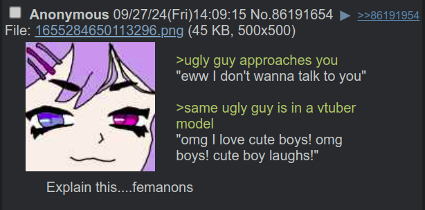 >>108686806I'm just saying, the type of guy hiding behind a vtuber model is probably not the kind of guy you'd like to kiss.