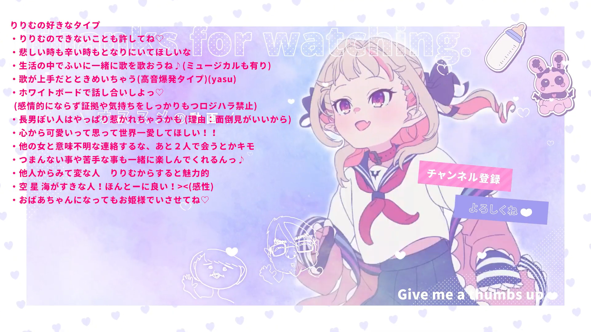 she also told us about on X there are a lot of dogs cute dogs on the time line but its different they are weird dogs and cats made by AI its not the same its awkward there was one she saw it was two cats like youtubers together were they eating som ething they were like youtuber it was a bit cute but it looks weird its diffeernt animals get a bit grotesque too with AI she cant look at them because its AI so it happens deformation it makes you feel sick too ririmu gets sick looking at the movements on AI video it give ririmu nausea it make her little child body feel bad its unnatural yea its her brain doing some thing bad it looks human but there is different with it some thing is wrong so it make her sick she read some one about movies with AI if they made one the viewers would puke she wouldnt be able to watch ririmu until the end there people that will vomit too on the movie she would get worse its yea they would vomit a lot there is also AI horror game she saw ririmu there was some thing that was happening where people were using the AI from Elon-san she forgot the name its groppy gropp gropp groppy ah its grok to remove the clothes on girls and make them almost naked so a lot of people were complaining that is really disgusting and awful and she hate it ririmu it was so much so she read that it got made into paid only she thought why it become like that too she thought ririmu if someone she liked did that what would ririmu do its just extremely disgusting if your boy friend did that irrimu just doing that only just she would just break up its awful seh hate it but probably a lot of guys in school are doing it so nothing can be done she cant do any thing ririmu they are too stimulated from sex stuff erotic she thinks ririmu its not okay all that eroticism its not good she told us those boys at schools going to ranked like that they first have to go casual ranked you cant go back casual is okay in games there is ranked and normal or unrated you play APEX or LoL or Valo they have diffeernt words its unrated for Valo LoL its normal APEX its casual there is ranked then so yea she was busy ririmu looking for an art to use for her ideal type partner list that happens she almost used an image of light she laugh a lot ririmu so the final list she told us its first forgive ririmu for the things ririmu cant do second be by her side when she is sad or in pain third sing together in daily life out of now here musicals are fine too four discuss things using white boardfifth dont get too emotional there is evidence and feelings but logic harassment is banned sixth she might like more eldest son kind of guy they are good at taking care of other seventh think ririmu is cute from the bottom of their heart want to be loved the most in the world eight dont make contact witho ther women or meet up alone the two nineth enjoy boring stuff or things bad at together with ririmu tenth being weird from the perspective of other but with ririmu she think attractive from her eleventh people that like sky stars and sea its really good twelveth even if ririmu becomes obaachan let her be the princess so yeah those are all the ones for this year and it may or may not change next year but thats it she also told us makoto doesnt fit her type at all though so yeah she told us bye bye till next stream otsupoe i will always think about you