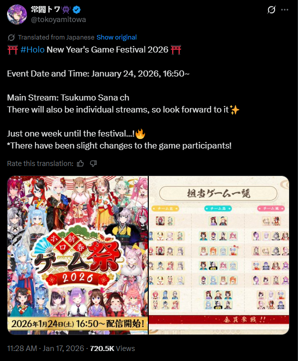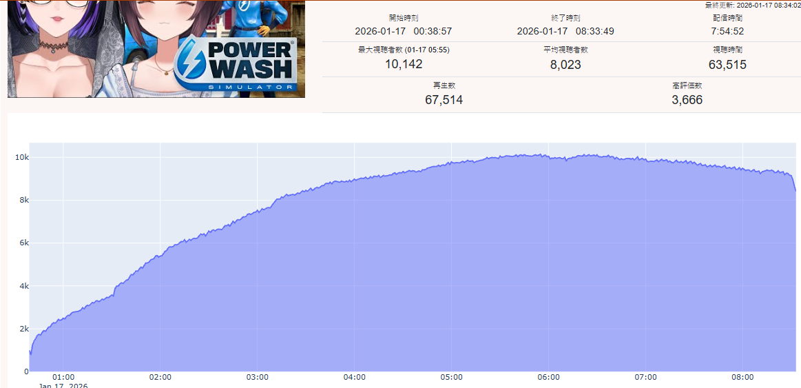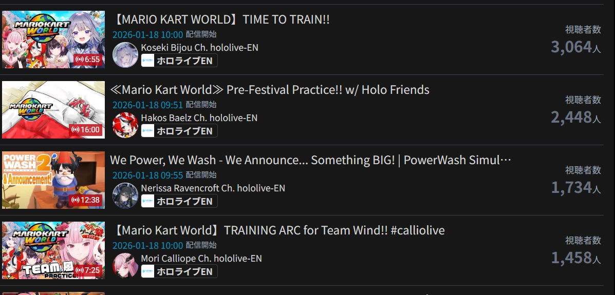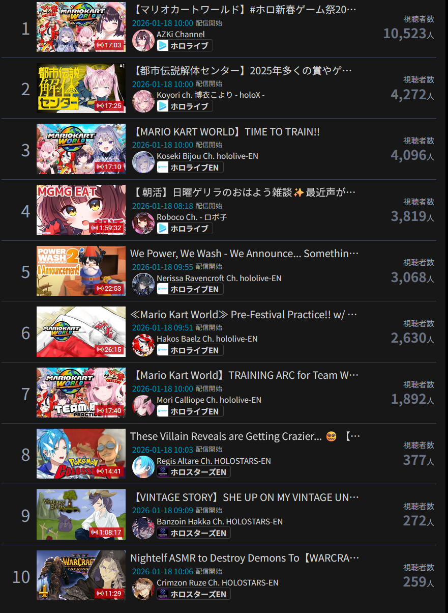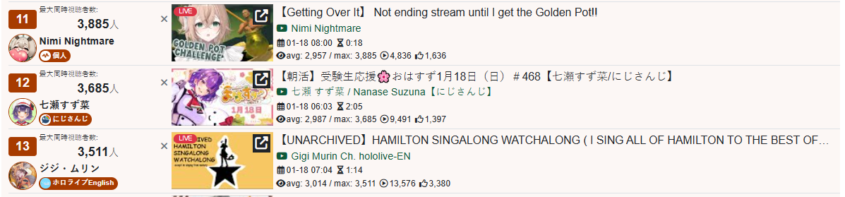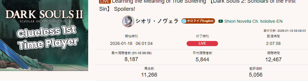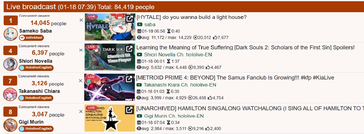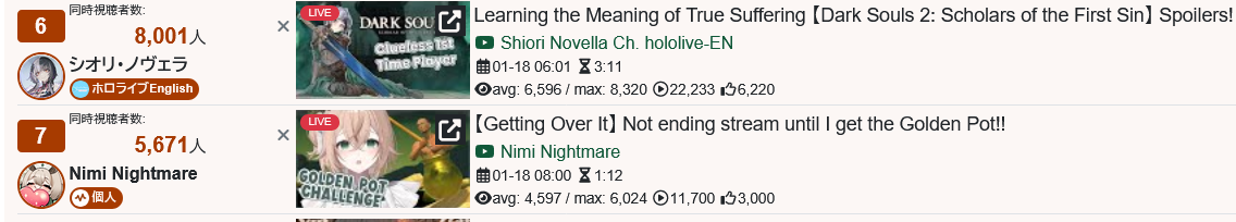 *JANUARY 17TH 2026 FINAL EN TALLY*>11,705: Calliope (Hololive English)>11,640: Bijou (Hololive English)>10,162: Meloco (Nijisanji "English")>7,843: Claude (Nijisanji English)>7,490: Gigi (Hololive English)>6,481: Raora (Hololive English)>6,197: FUWAMOCO (<3) (Hololive English)>5,441: Clio (Phase Connect)>5,356: Clio (Phase Connect)How do you get 7k with a 3D Live? Jesus Christ. Gold for Mori Calliope's playthrough of Sekiro Shadows Die Twice, Silver for Koseki Bijou's third playthrough of Dark Souls 3, bronze for 汚いチンポしゃぶる売女 and her ten thousandth playthrough of Powerwash Simulator 2.>RANKING PER POINTS (Gold = 3, Silver = 2, Bronze = 1)Bijou = 20pIRyS = 13pKronii = 12pCalliope, Gigi = 11pMeloco = 8pSaba, Raora = 6pIna'nis, Zotto = 3pCecilia, Nerissa = 2pFUWAMOCO, Baelz, Nimi = 1p
