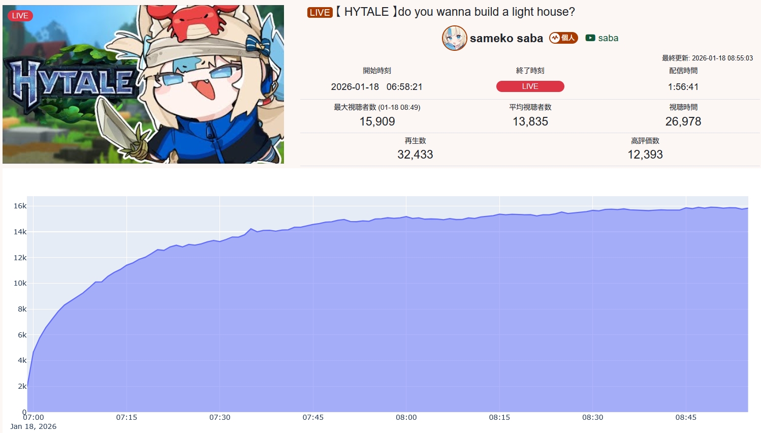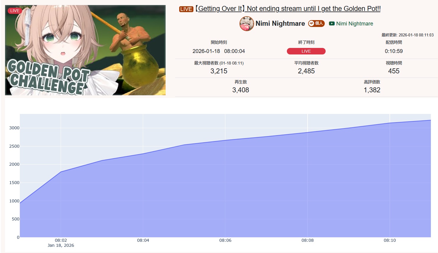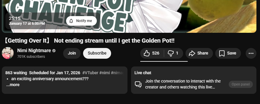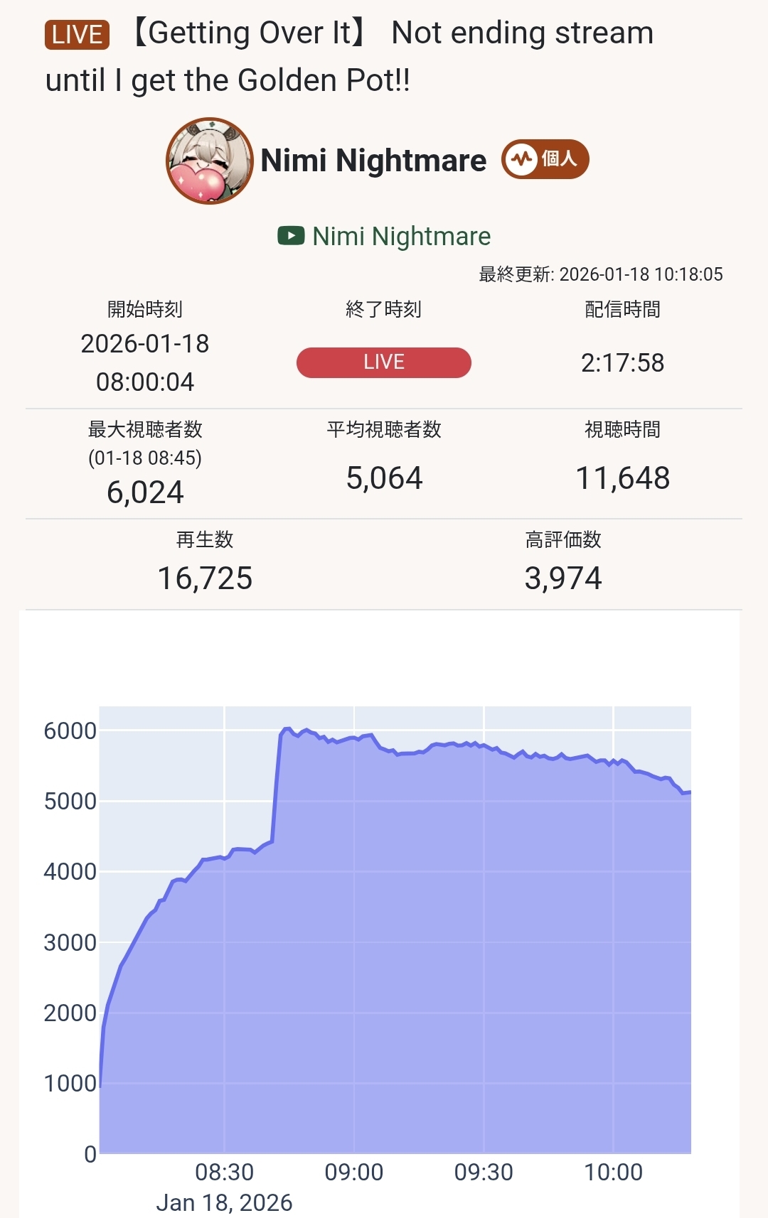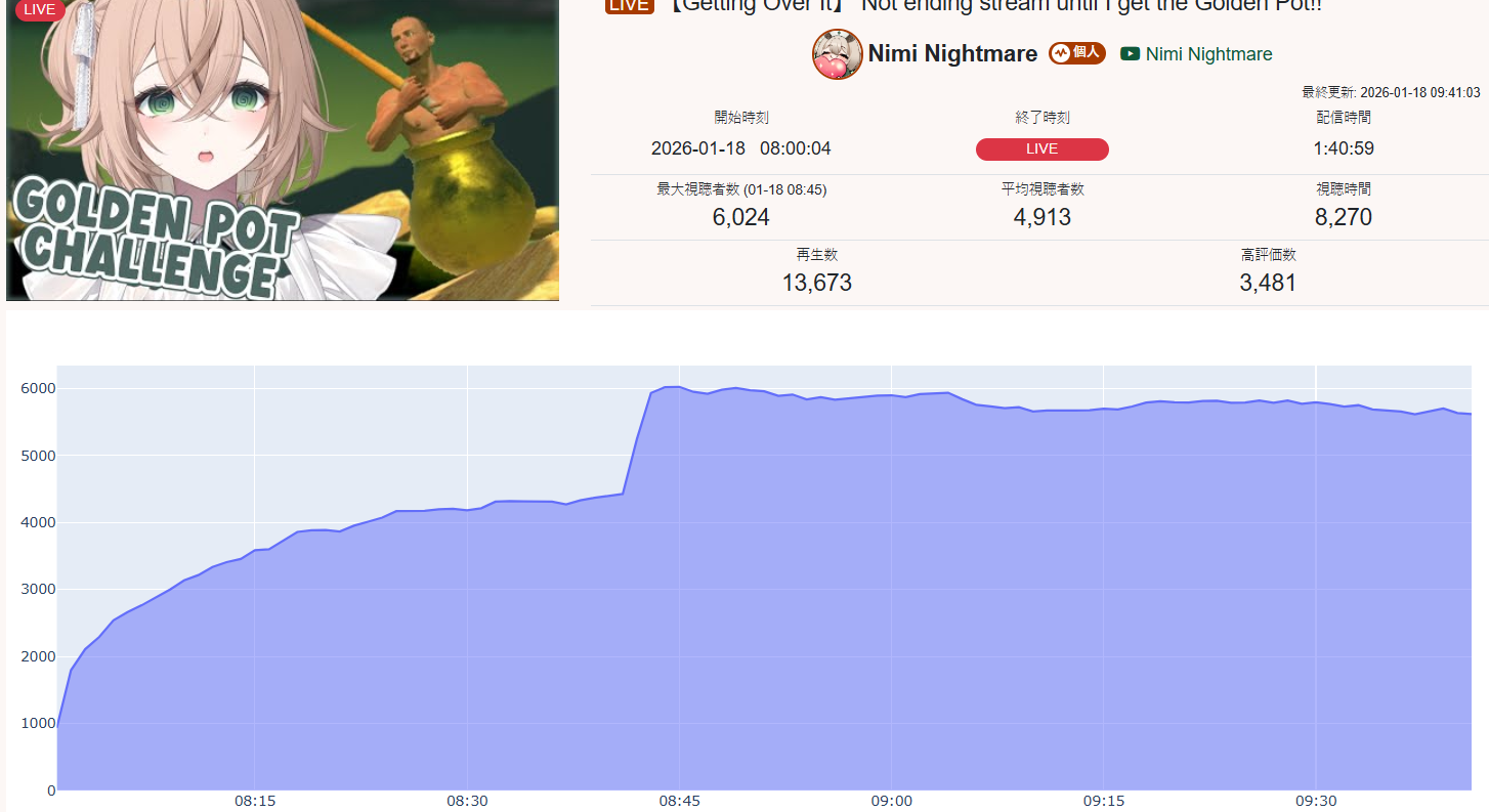 Ladies and gentlemen, I give you Nimi Nightmare's birthday announcement stream featuring:>4k ccv pre raid>A raid from a shitter whore into bleeding out the raid for hours>A total maximum peak of 6k ccvThoughts?