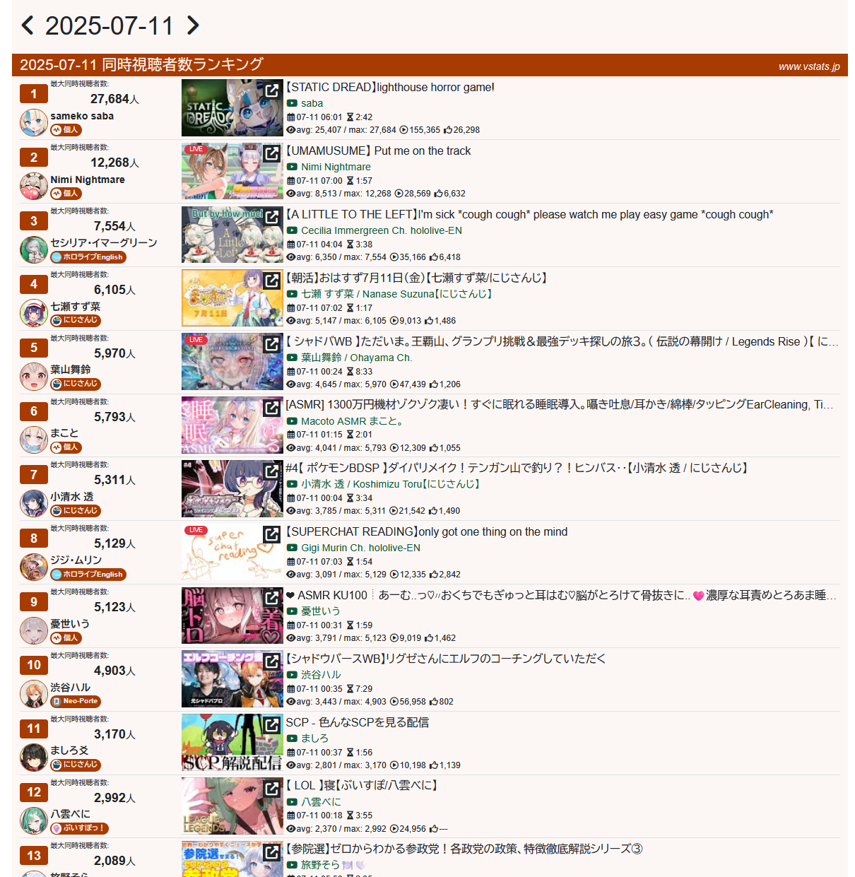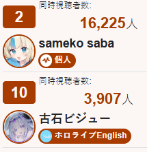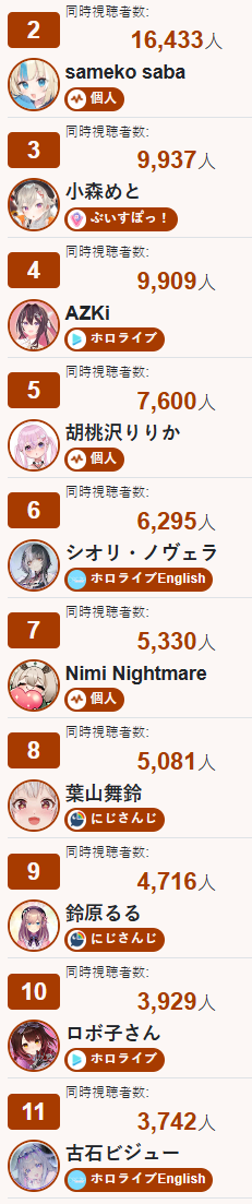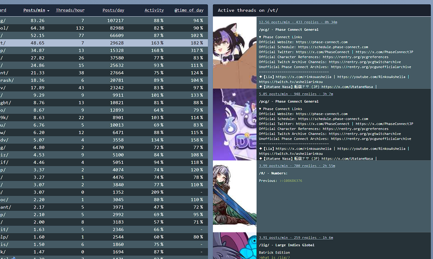 *GENERAL NUMBERFAG SITES*>https://playboard.co/en/>http://ikioi-ranking.com/>https://vrabi.net/>https://www.vstats.jp>https://live-ranking.userlocal.jp/vtuber-ranking>https://vt.poi.cat/Hololive sites>https://www.hololyzer.net/youtube/index.html>https://trackholo.live/en/>https://holo-spotify-stats.jirikunes.eu/Twitch sites>https://sullygnome.com/>https://twitchtracker.com/>https://stats.roki.sh/>https://streamscharts.com/