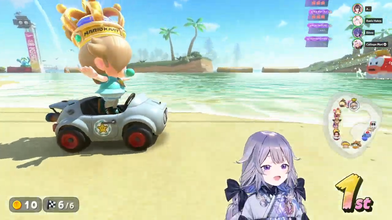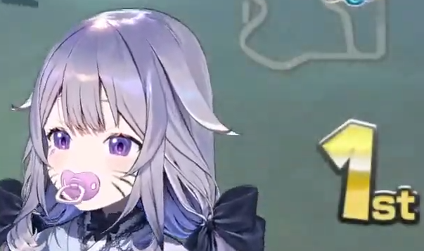 Mori getting mario kart'd by the bibs. Cute