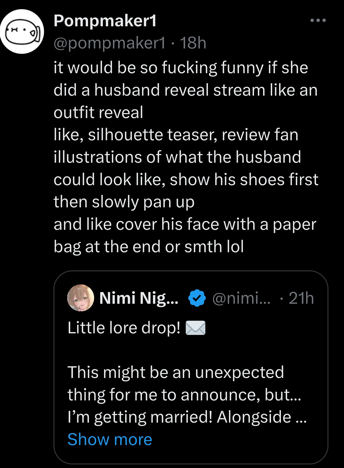 >>108719479Lmfao that implies Nimi respects her band of cuck simps because she starts on time