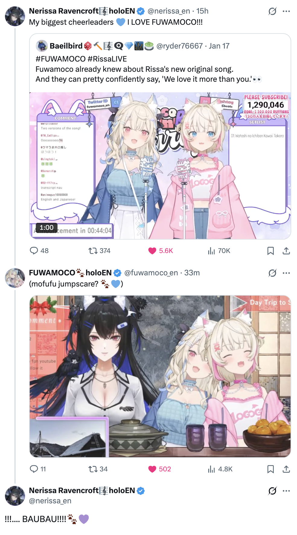 previous thread >>108708274>Next Streamwape>Previous Streamhttps://www.youtube.com/watch?v=GyFiWsuW7K0>1st orisong BORN TO BE "BAU"DOLhttps://www.youtube.com/watch?v=aThUfmKQgaY>2nd orisong Lifetime Showtimehttps://www.youtube.com/watch?v=Nj17tbZP4oA>Debuthttps://www.youtube.com/watch?v=Kttt7pb5o6I>3D Debuthttps://www.youtube.com/watch?v=zqiU63uqC9U >3D Livehttps://www.youtube.com/watch?v=ouQF2A1l_cI>Youtube Channelhttps://www.youtube.com/@FUWAMOCOch/featured>ScheduleTBD>Unarchived Content (twitter spaces, karaokes, etc)https://rentry.org/baunarchivedhttps://odysee.com/@FUWAMOCOch:2>Official playlist of all covers and songs they've released or starred in.https://www.youtube.com/playlist?list=PLf4O_VcbYo24EjtizbTZt_tTgwXaaK8N->Merchhttps://shop.hololivepro.com/collections/fuwawaabyssgard (Fuwawa)https://shop.hololivepro.com/collections/mococoabyssgard (Mococo)>/baubau/-related content (baubau sings, nsfw, VN/anime list, VTL team info)https://rentry.org/baucontent>Thread Templatehttps://pastebin.com/bgugZTcD