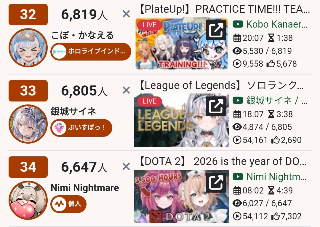 *GENERAL NUMBERFAG SITES*>https://playboard.co/en/>http://ikioi-ranking.com/>https://vrabi.net/>https://www.vstats.jp>https://live-ranking.userlocal.jp/vtuber-ranking>https://vt.poi.cat/Hololive sites>https://www.hololyzer.net/youtube/index.html>https://trackholo.live/en/>https://holo-spotify-stats.jirikunes.eu/Twitch sites>https://sullygnome.com/>https://twitchtracker.com/>https://stats.roki.sh/>https://streamscharts.com/