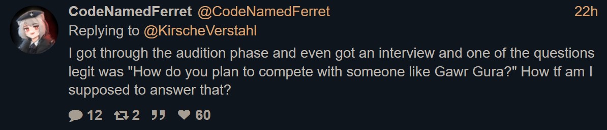 >>108740630Yeah, if you don't have an answer to that, maybe you're not the pick for the number two EN agency. It's not like they asked "how do you plan to beat Gawr Gura", they asked "how do you plan to compete", which is a valid question: Why would someone who could watch gura choose to watch you instead?In other words, she got filtered for being dumb.