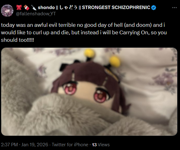 I've been banned from 2 Vtubers' Twitch channels and Discords now.I realised I don't fit into their communities.This is fine honestly: why would you want to spend time with your oshi's other fans? Just because you all like the same woman, doesn't mean you all are alike.