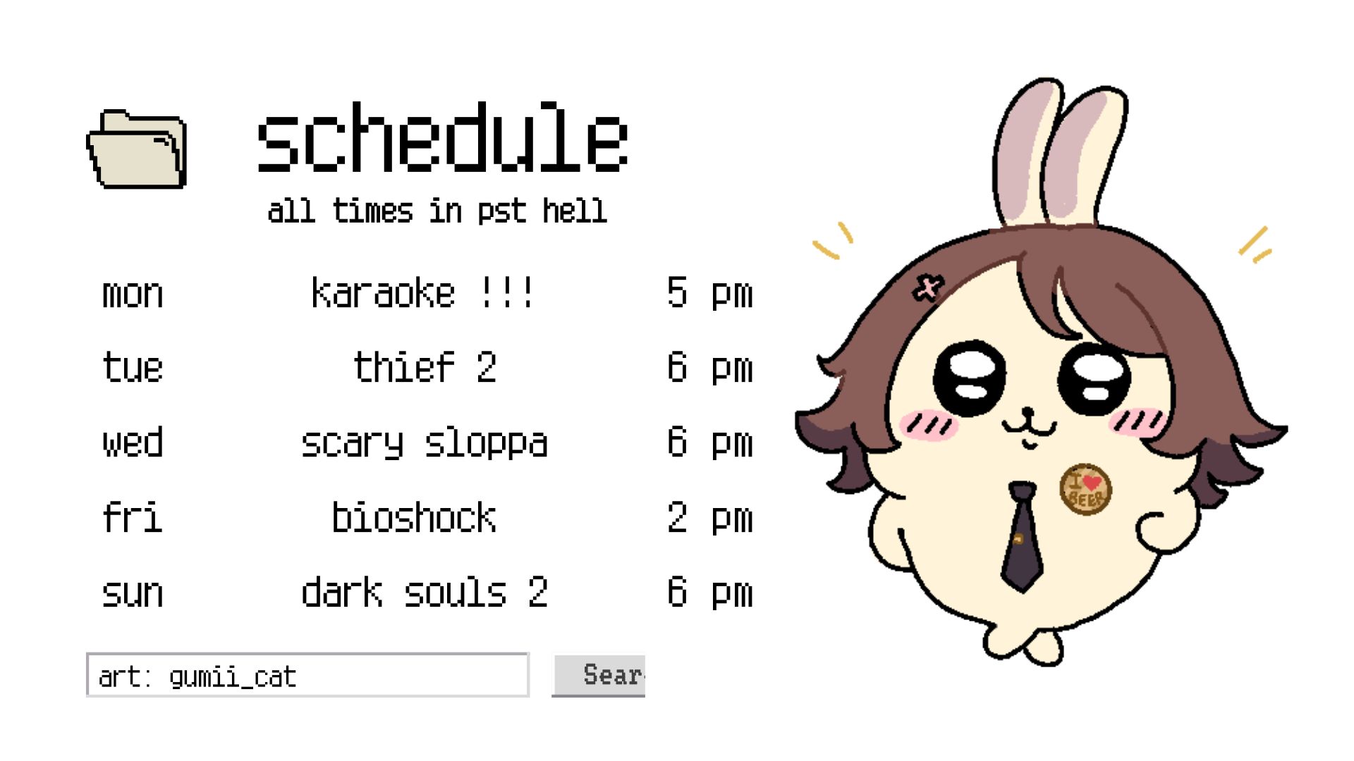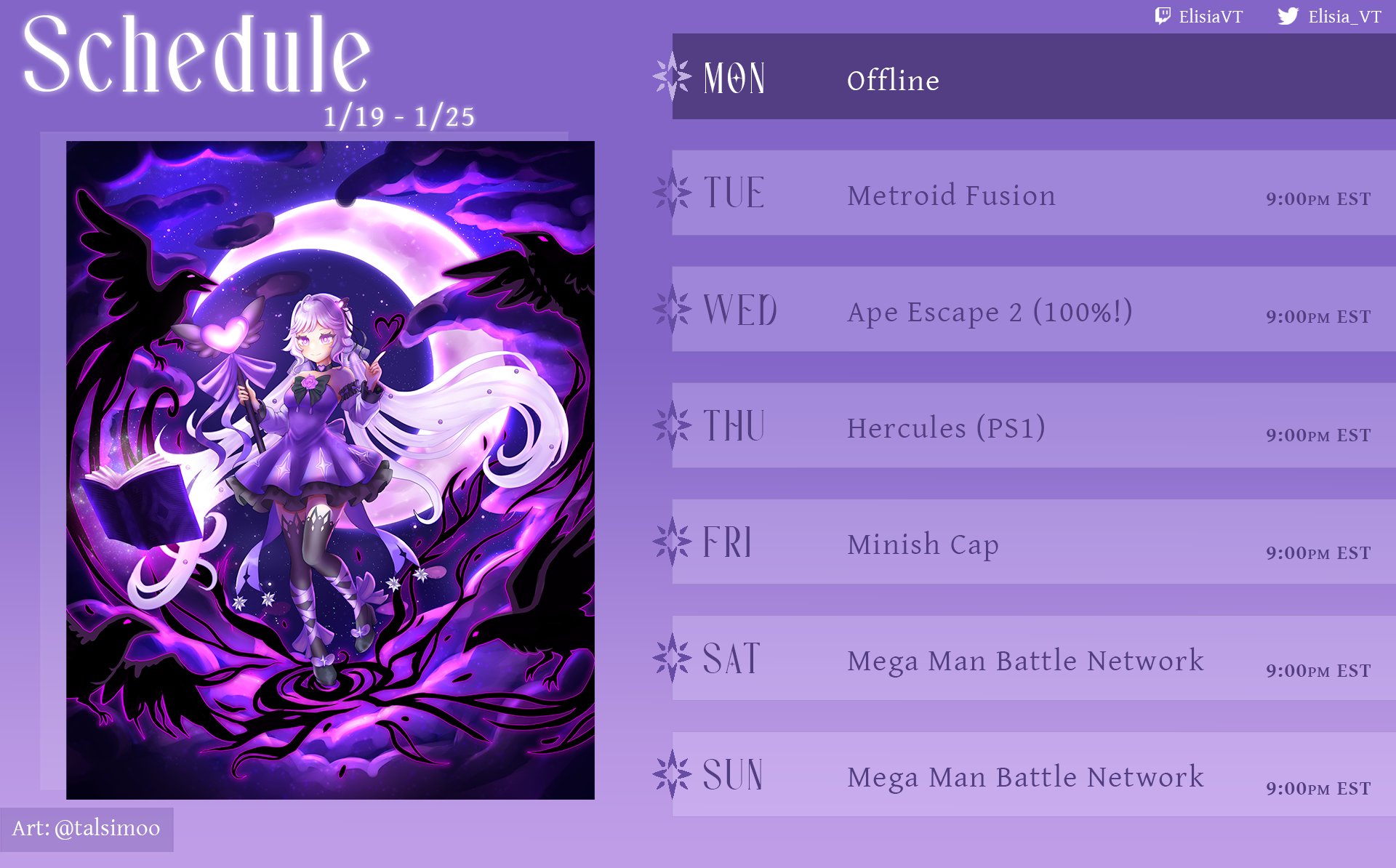 Elisia schedule for the week. She's starting Mega Man Battle Network.